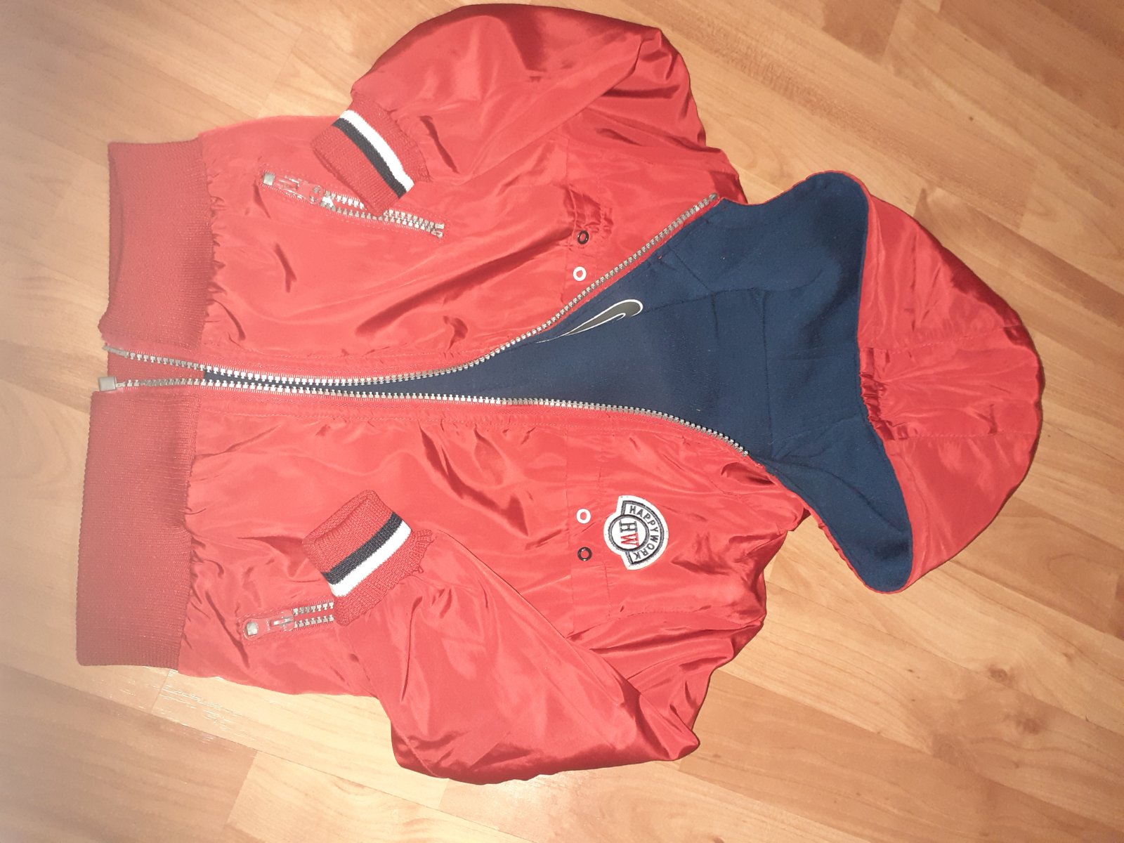 Nosena obojstranná vetrovka. Treba opraviť zips. Velkost uvedena odhadom.