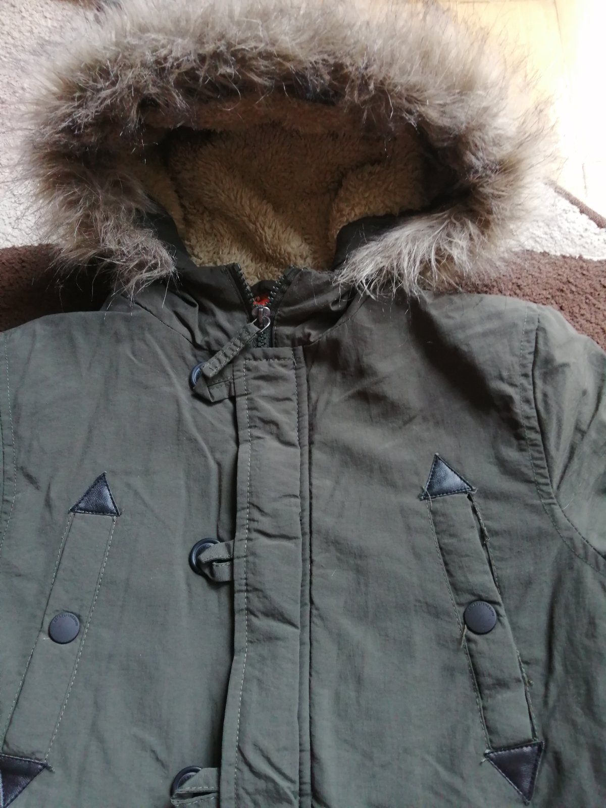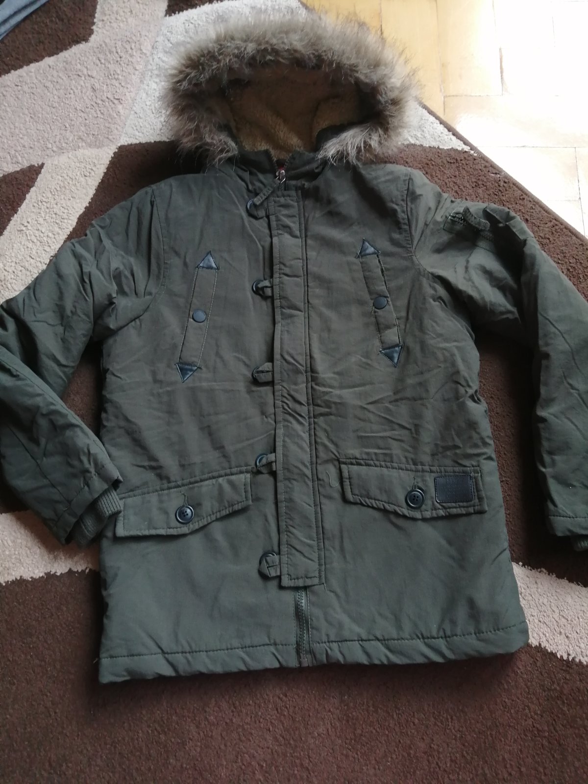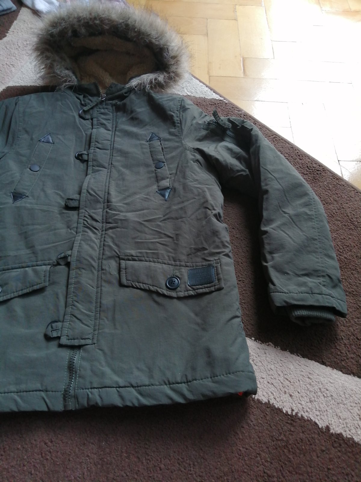 Krásna chlapčenská zimná bunda, vrch je pevný šušťak, kožené detaily, nosená do školy, super noseny stav. Rukáv od krku 64cm, dĺžka 61cm, šírka 44cm