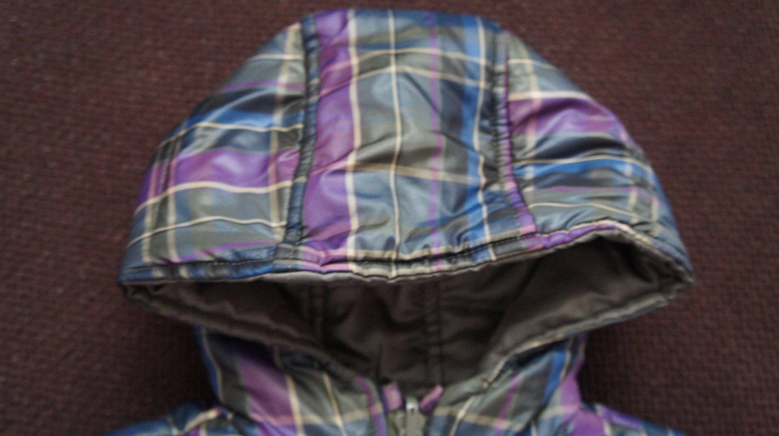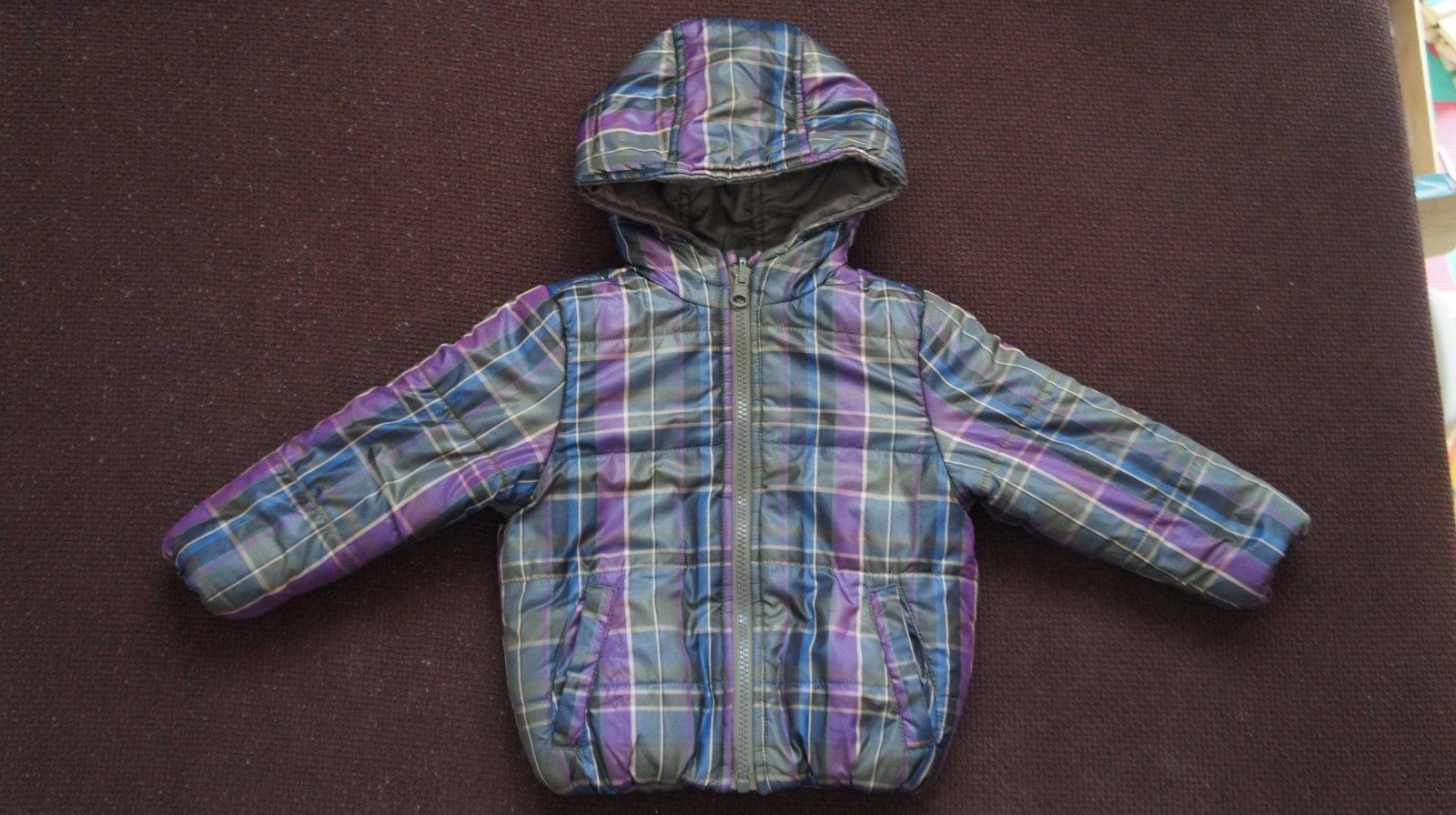 Obojstranná zimná bunda s kapucňou (kapucňa je napevno). My sme ju nosili len z tej strany károvanej - kombinácia fialová, tmavomodrá, čierna, tmavozelená vojenská. Z druhej strany nenosená - tmavozelená vojenská farba. Veľkosť 86 cm, 18-24 mesiacov.