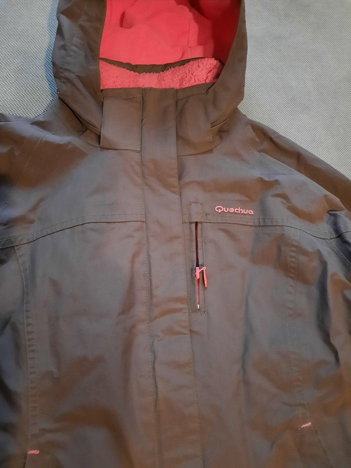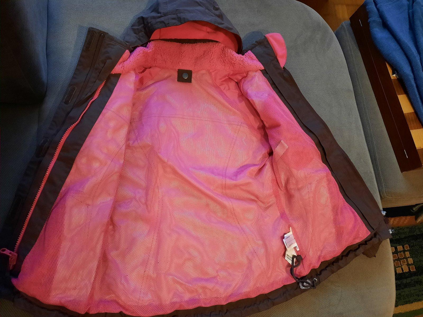 Peknučká nosená -nepremokavá, neprefukatelna bunda, kapucňa sa dá odopnút, tmavohnedá v kombinácii s ružovou, vhodná na prechodne počasie. Mali sme aj vnútornú mikinu, no stratili sme ju.