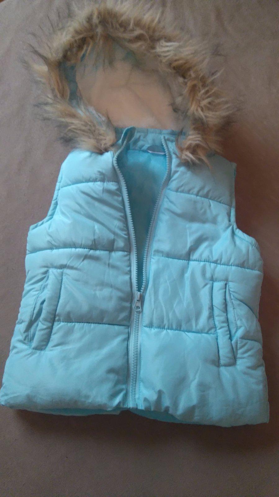 Top stav - bledomodrá až svetlotyrkysová zateplená vesta s potlačou motýlikov je vhodná pre malú cca 5-6 ročnú parádnicu. Na zadnej časti je umiestnený reflexný prvok, srdiečko.