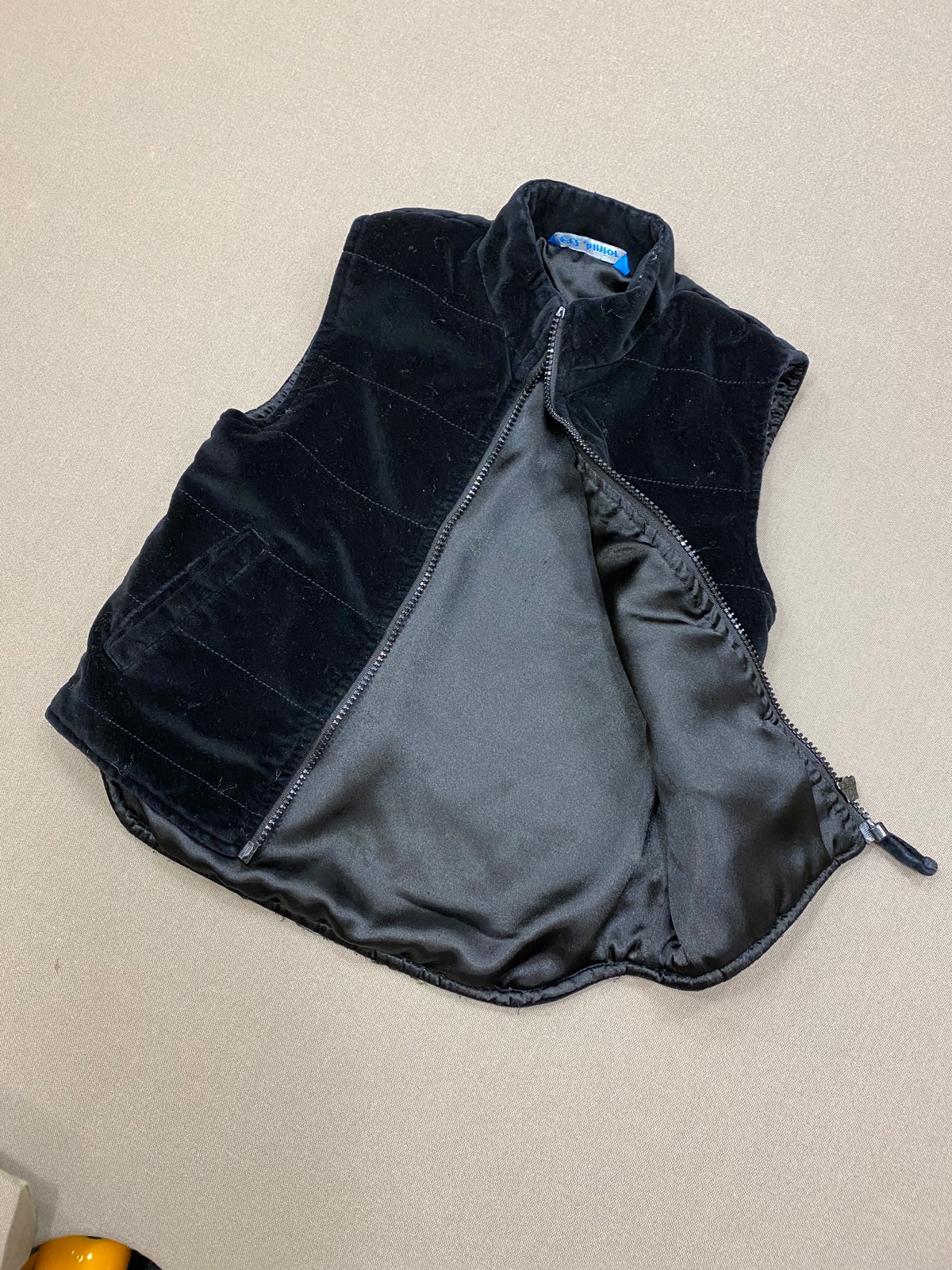 Nádherná zamatova vestička v čiernej farbe. Ako nová. Malinko nosena. Vhodná ako unisex. Celková dĺžka 40cm vpredu, vzadu o 4cm dlhšia. Sirka cez hrudnik 33cm.