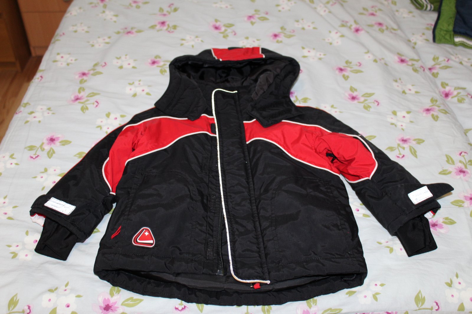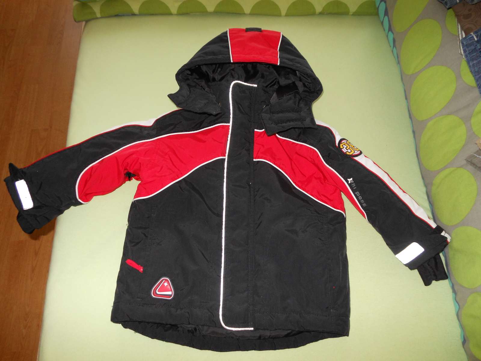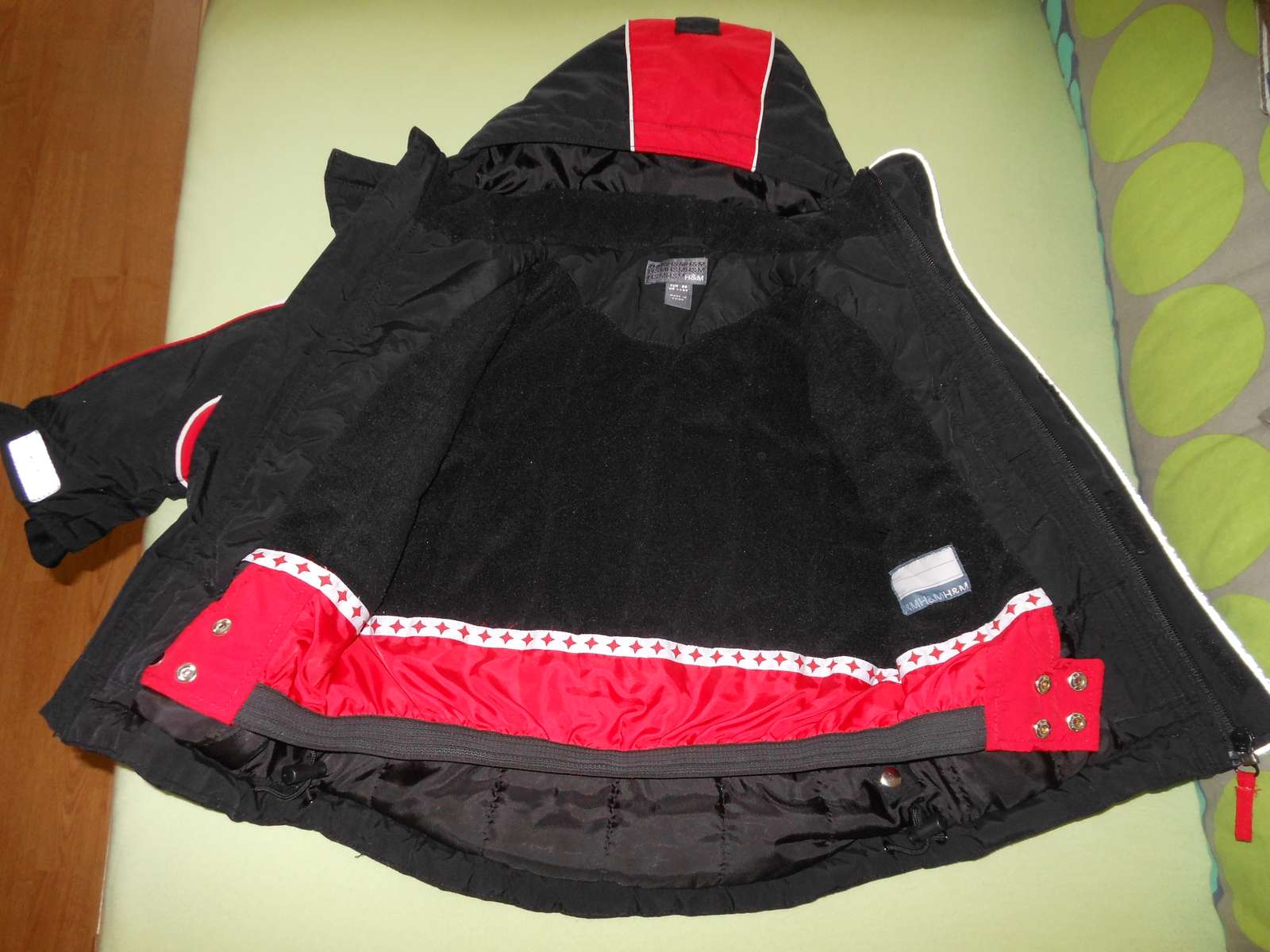 Predám krásnu málo nosenú červenočiernu lyžiarsku bundičku H&M, veľkosť je 86, na 12 až 18 mesiacov, ale my sme ju nosili ako 92/98, je totiž podstatne väčšia. Je bez chýb, iba žmolčeky na podšívke a na predĺžených rukávikoch s otvorom na palček a ten biely pásik už nie je snehovo biely a reflexné pásiky sú trošku ošúchané, ale nebráni to v ich funkčnosti. Je veľmi teplučká a má aj snežný pás a vetranie pod pazuškami (zips).