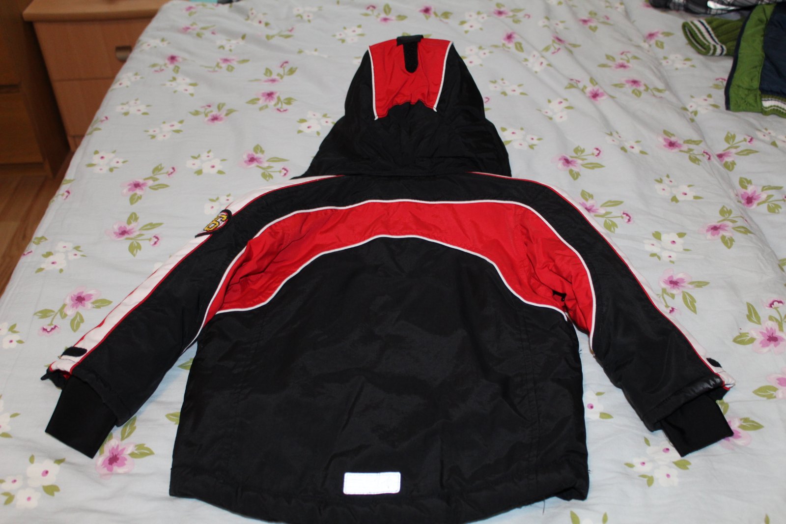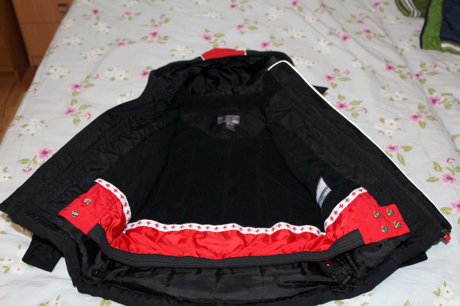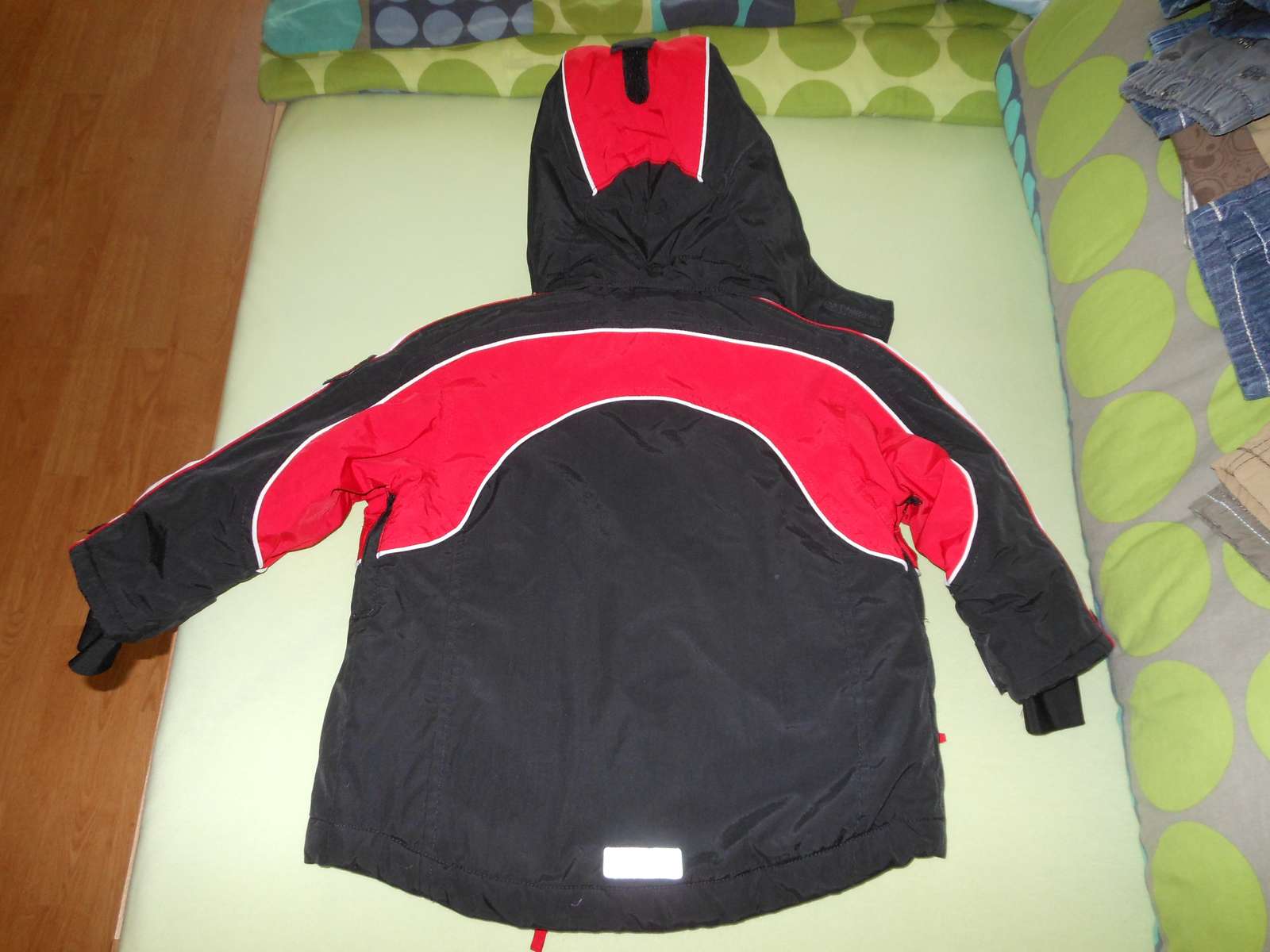 Predám krásnu málo nosenú červenočiernu lyžiarsku bundičku H&M, veľkosť je 86, na 12 až 18 mesiacov, ale my sme ju nosili ako 92/98, je totiž podstatne väčšia. Je bez chýb, iba žmolčeky na podšívke a na predĺžených rukávikoch s otvorom na palček a ten biely pásik už nie je snehovo biely a reflexné pásiky sú trošku ošúchané, ale nebráni to v ich funkčnosti. Je veľmi teplučká a má aj snežný pás a vetranie pod pazuškami (zips).