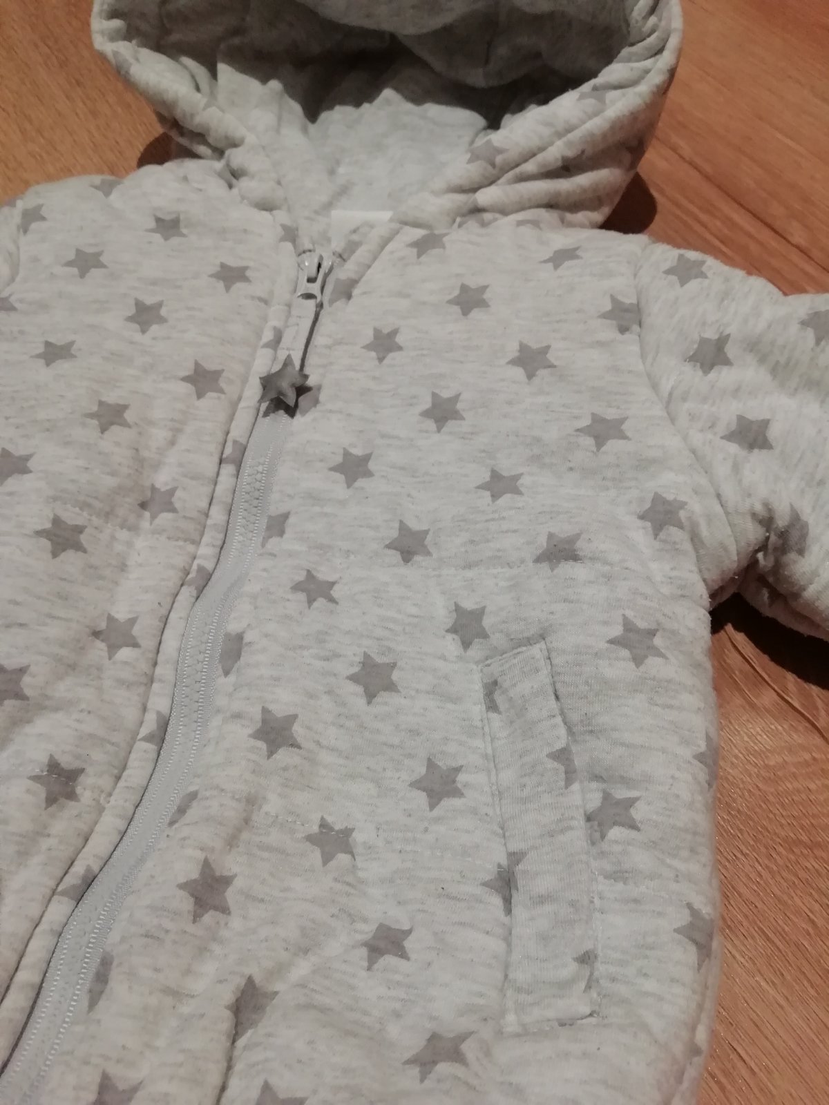 Hviezdickova bunda je zateplena, nosit sa mozr ako prechodná, syn nosil aj v zime do kočíka. Kapucna sa neda odopnut. Značka F&F, veľkosť písaná 6-9mesiacov, v pohode ponosite aj do roka. Žiadne poškodenia. Super stav.