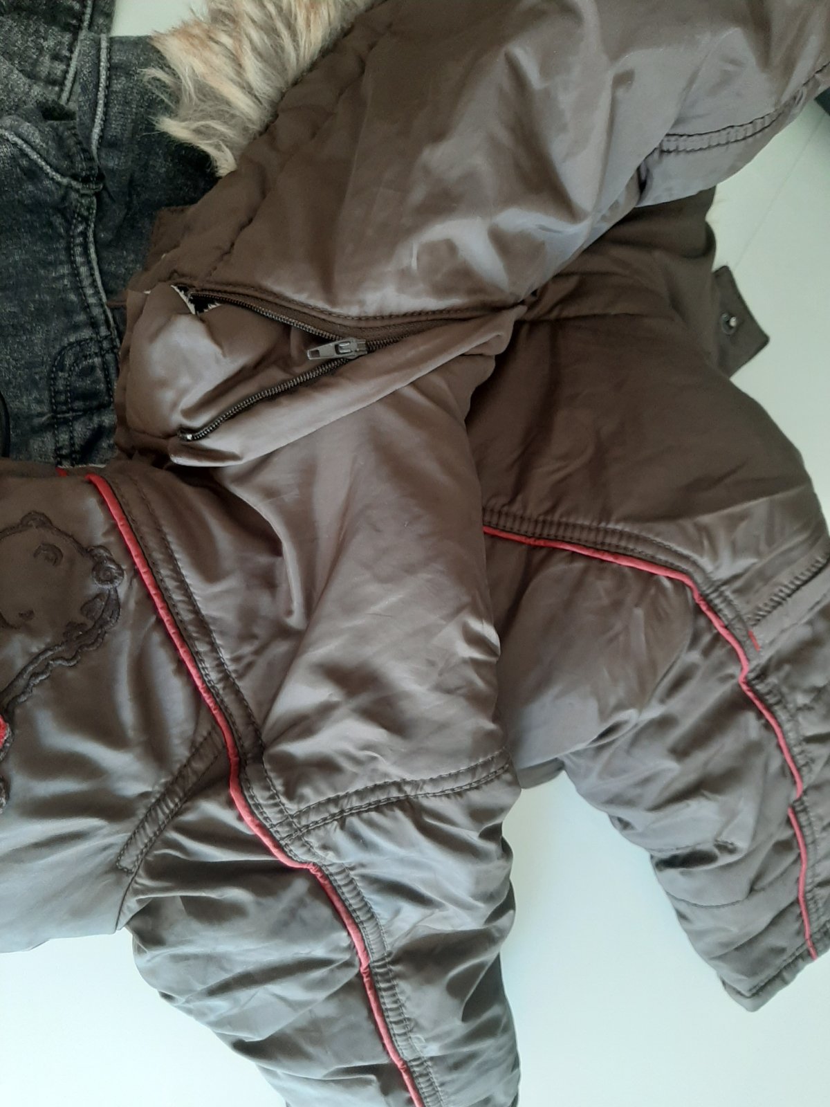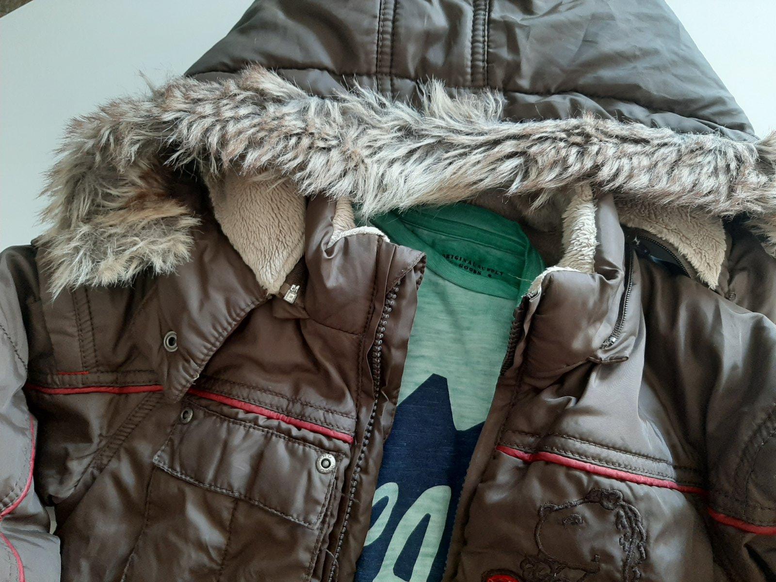 Pekná bunda hnedo-bielo-tyrkysovej farby (skôr ako posl. foto) v dobrom nosenom stave bez dierok, fľakov, zatrhnutí. Kapucňa je napevno.