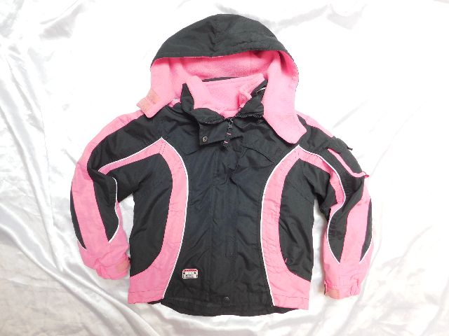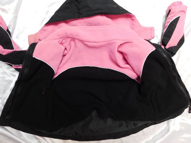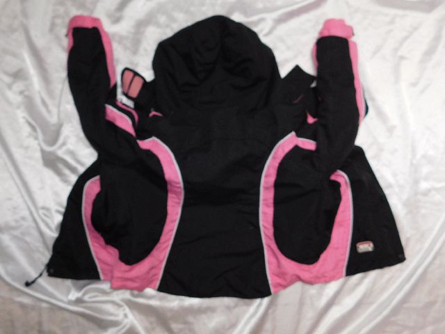 Kvalitna bunda 2v1 s odonimatelnou mikinou,s odonimatelnou kapucnou,čierno/ruzovej farby,odolna proti vode,snehu ,vetru,s mnohymi praktickymi vreckami.100%viskoza.super stav. b26