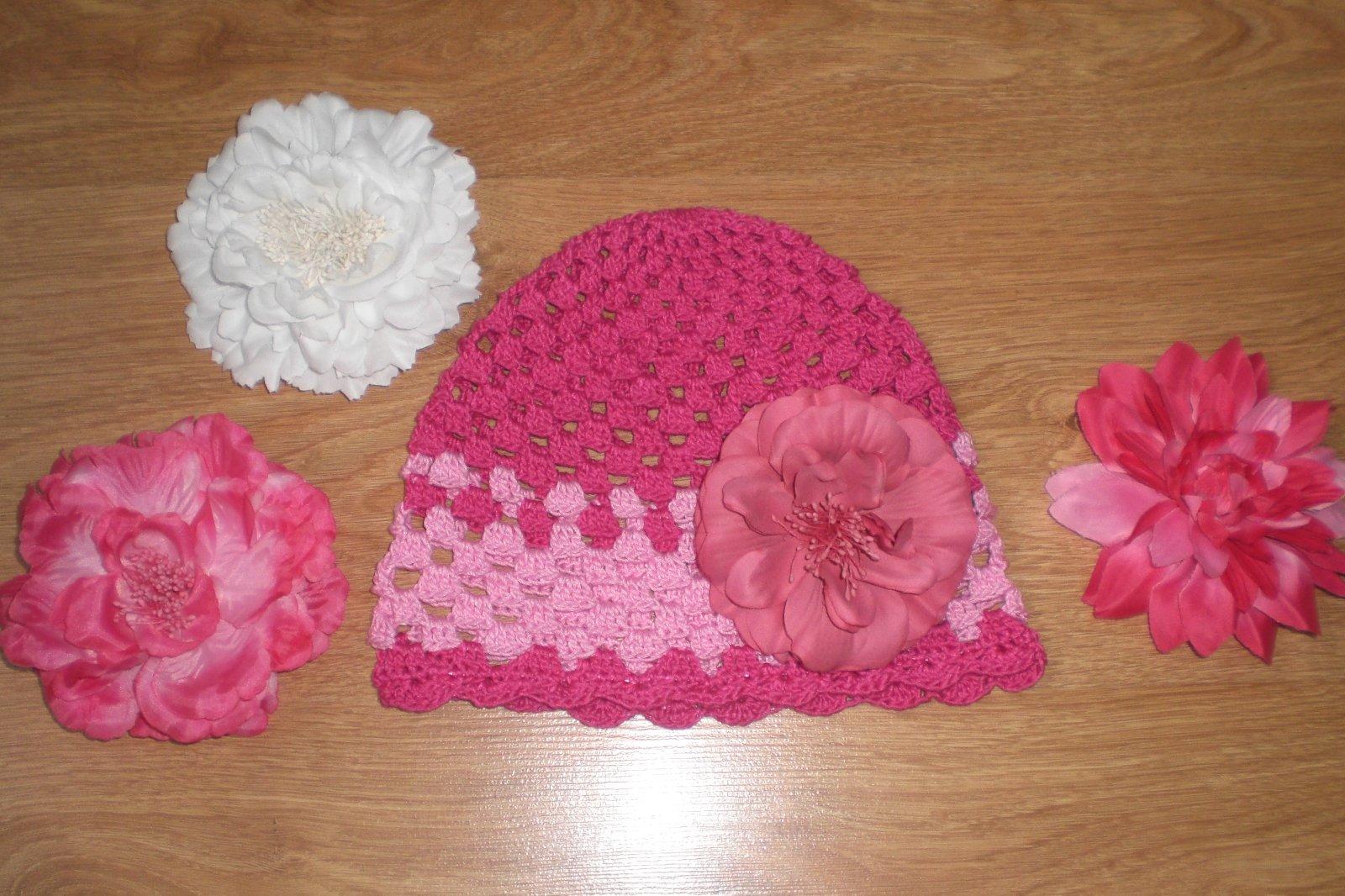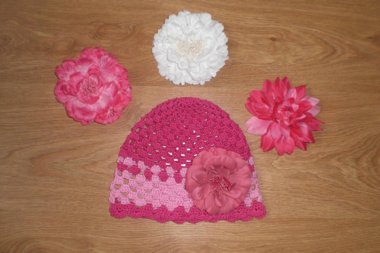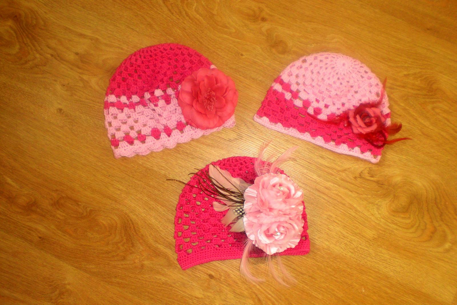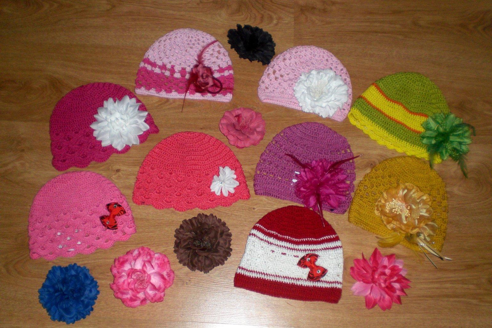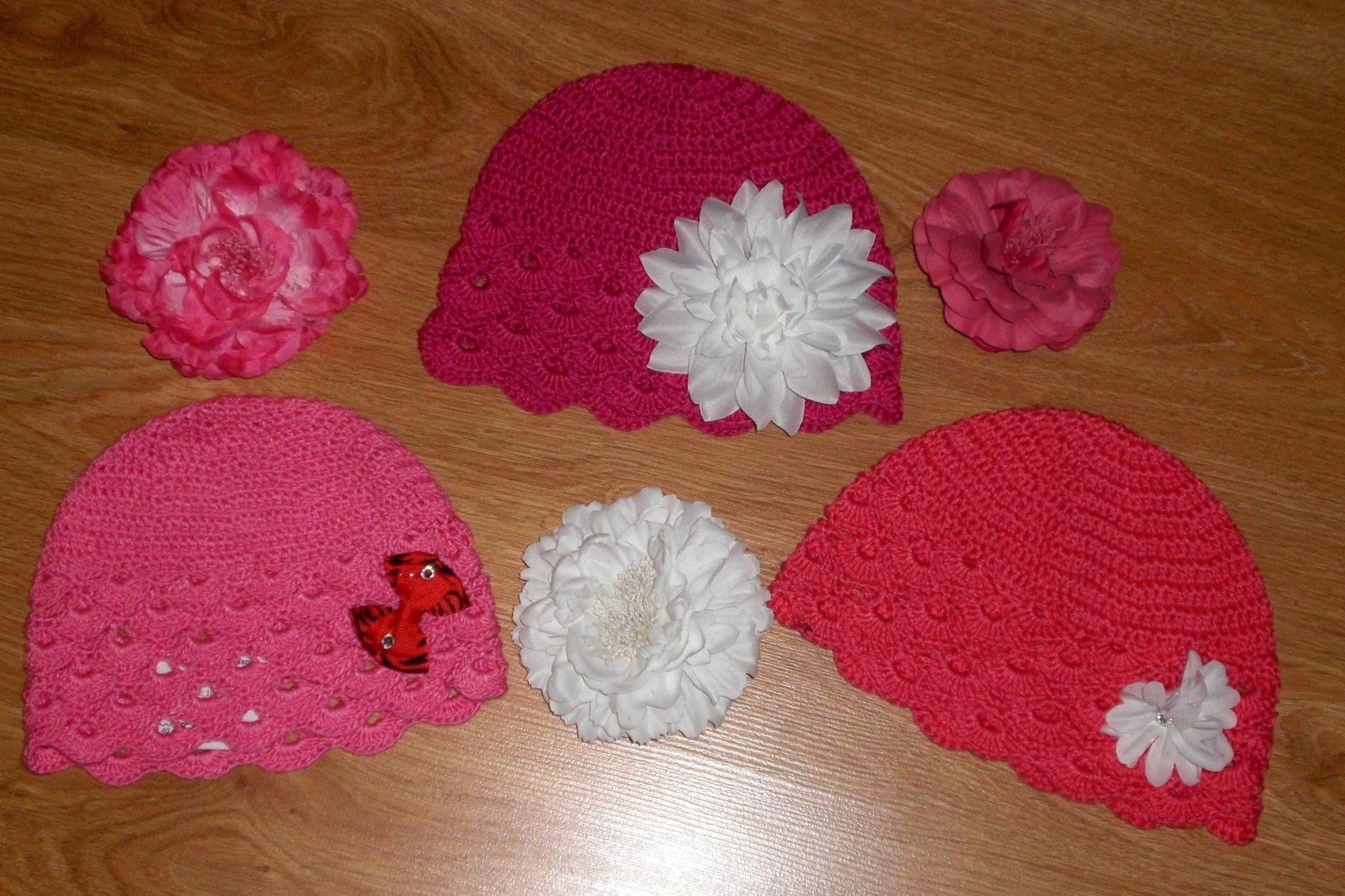 Háčkované čiapočky s veľkými odopínateľnými kvetmi.