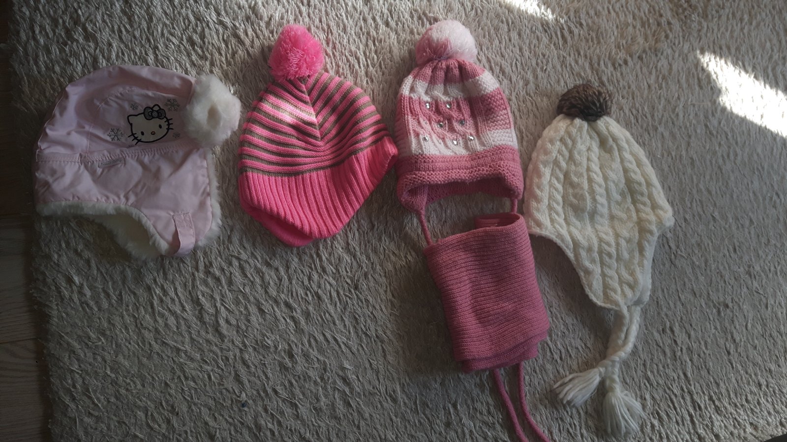 ciapky na 4-5rokov ,nalavo baranica len vyskusana 3,80€, vedla pasikava 3€ len vyskusana, tretia zlava suprava 6€, napravo hm-3€. spolu 11