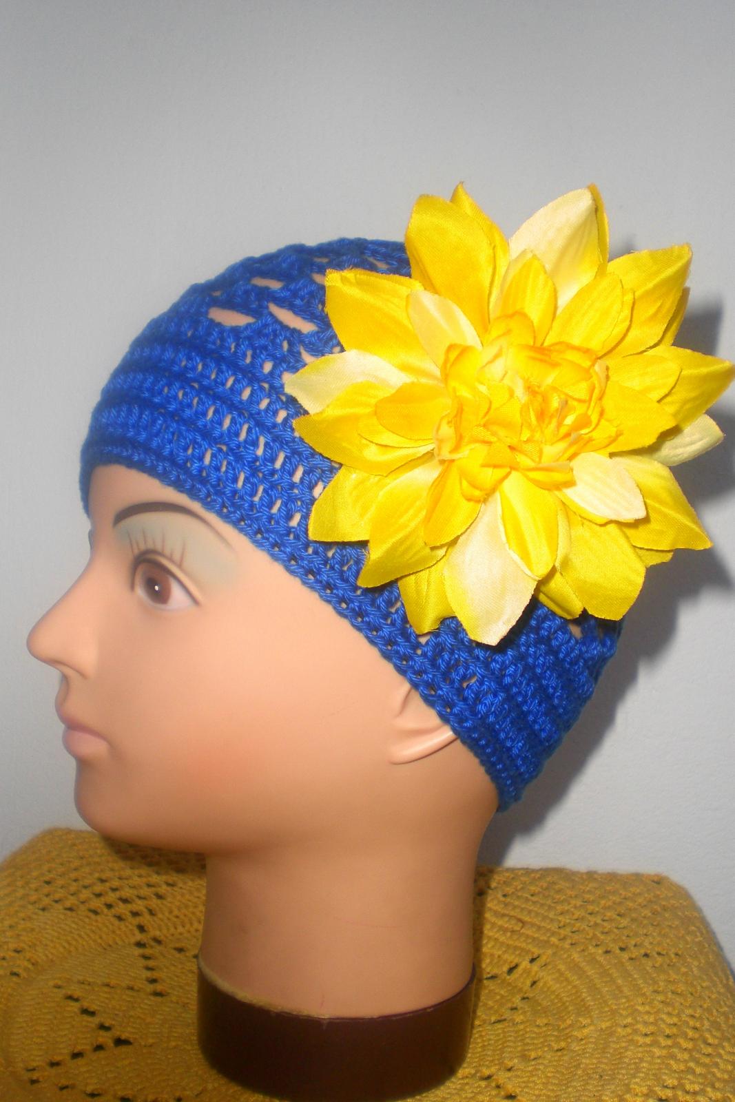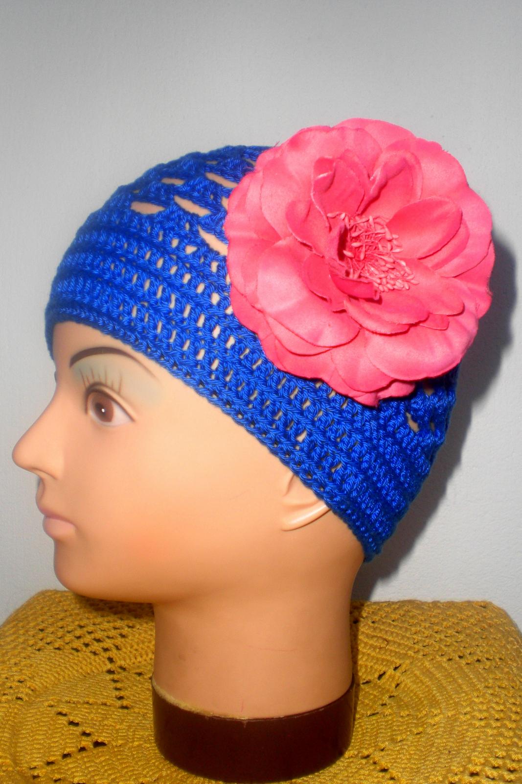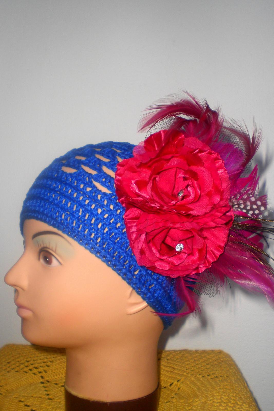 Háčkované čiapočky s veľkými odopínateľnými kvetmi.