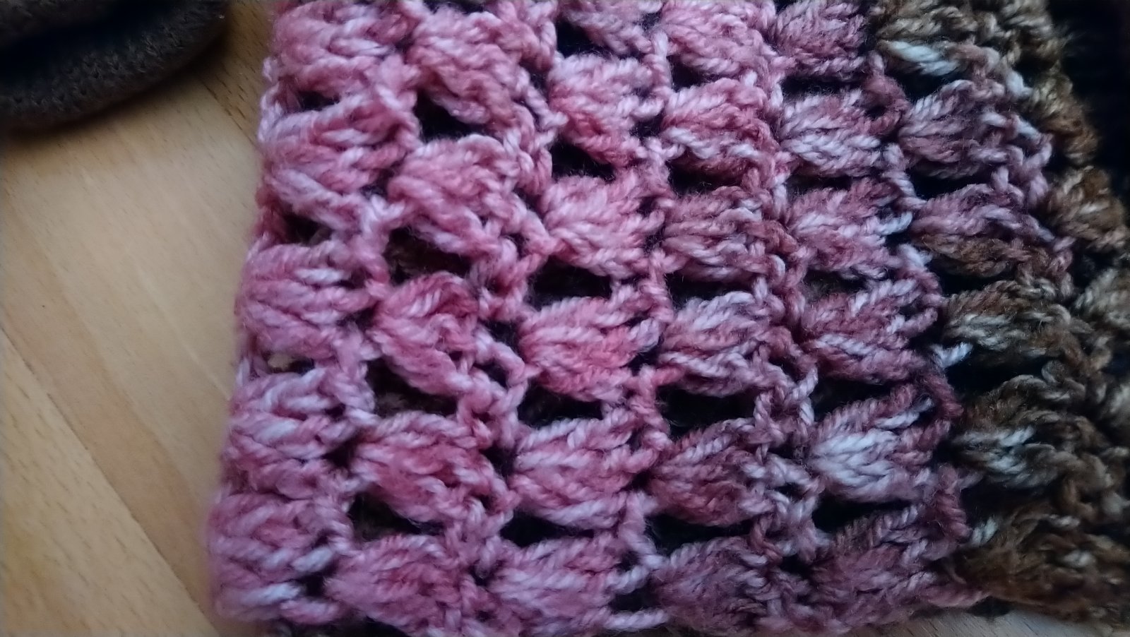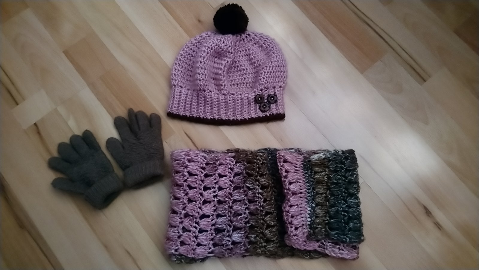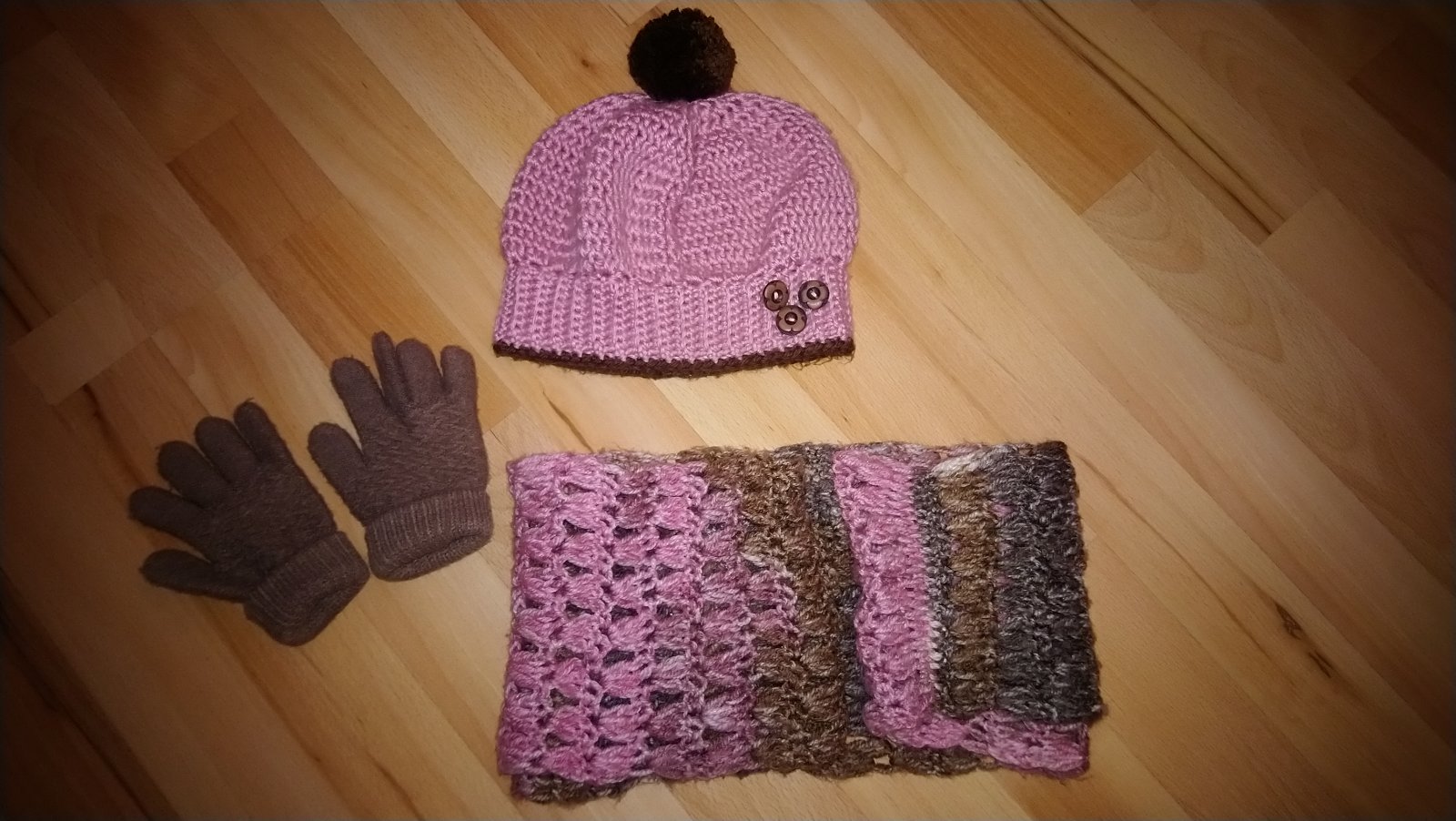 Ručné robené. Čiapka obvod 42 cm v pokoji natiahne sa na 50 cm, hĺbka 18 cm. Nákrčník dĺžka 2x 62 cm, rukavice dĺžka 16 cm.