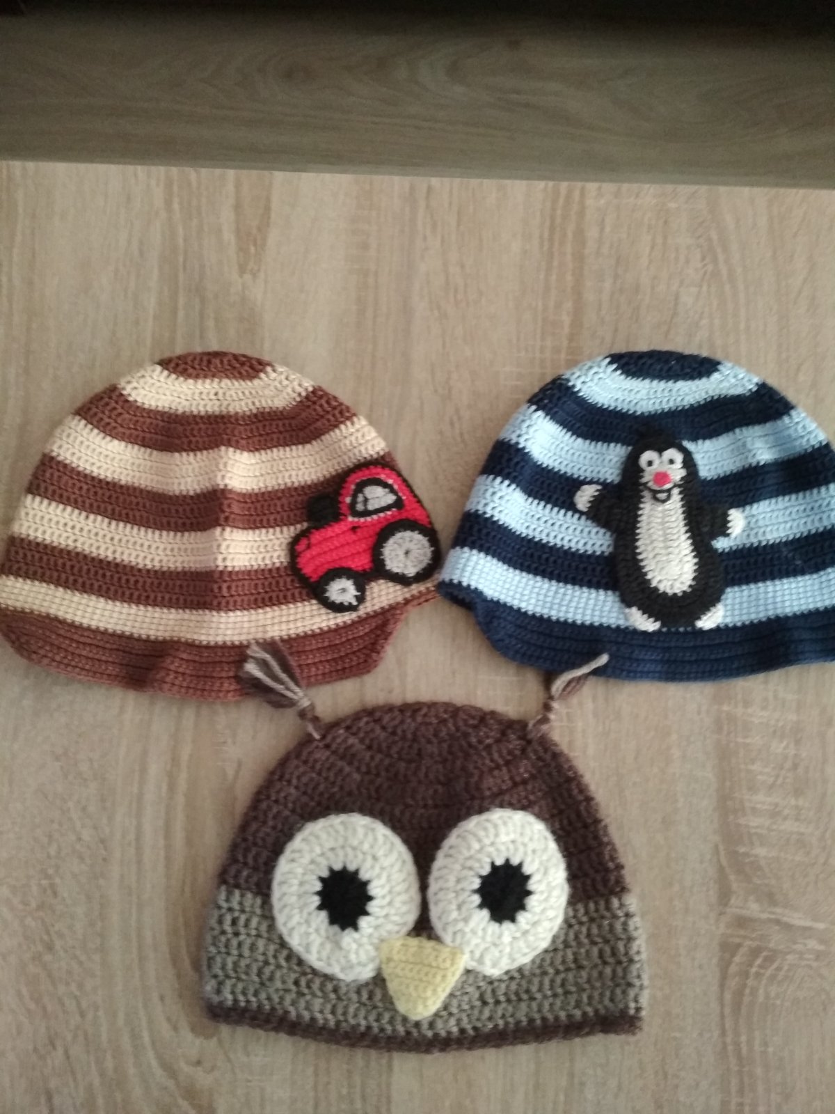 Predam hackovane ciapky, nosene ale stale v dobrom stave, sovickova rozmer:22cm, s krtkom rozmer:25cm a s traktorom rozmer:25cm, cena spolu 10eur, samostane kus 4 eur.