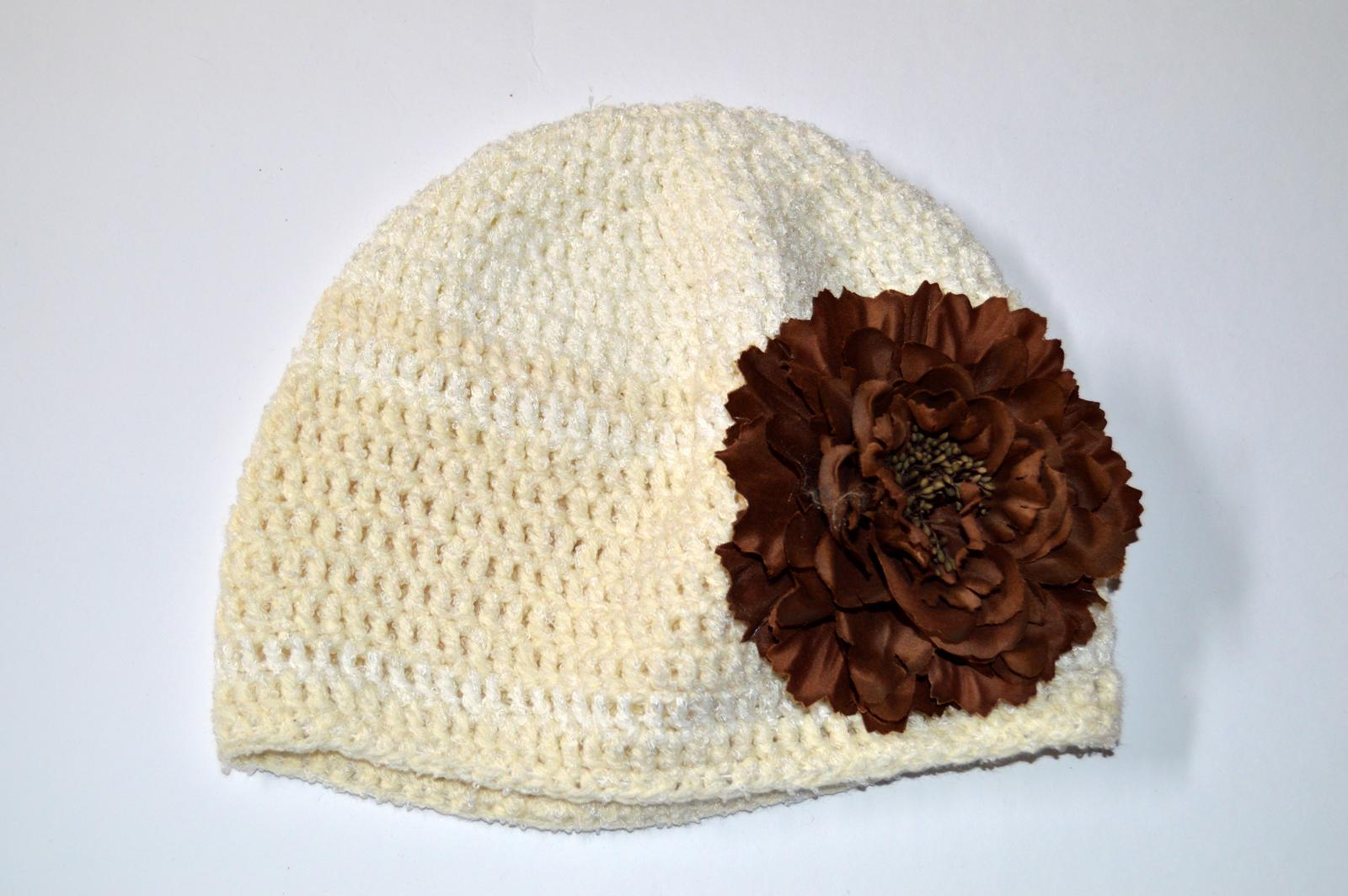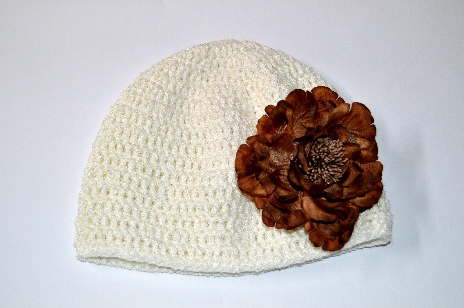 Háčkované čiapočky s veľkými odopínateľnými kvetmi.