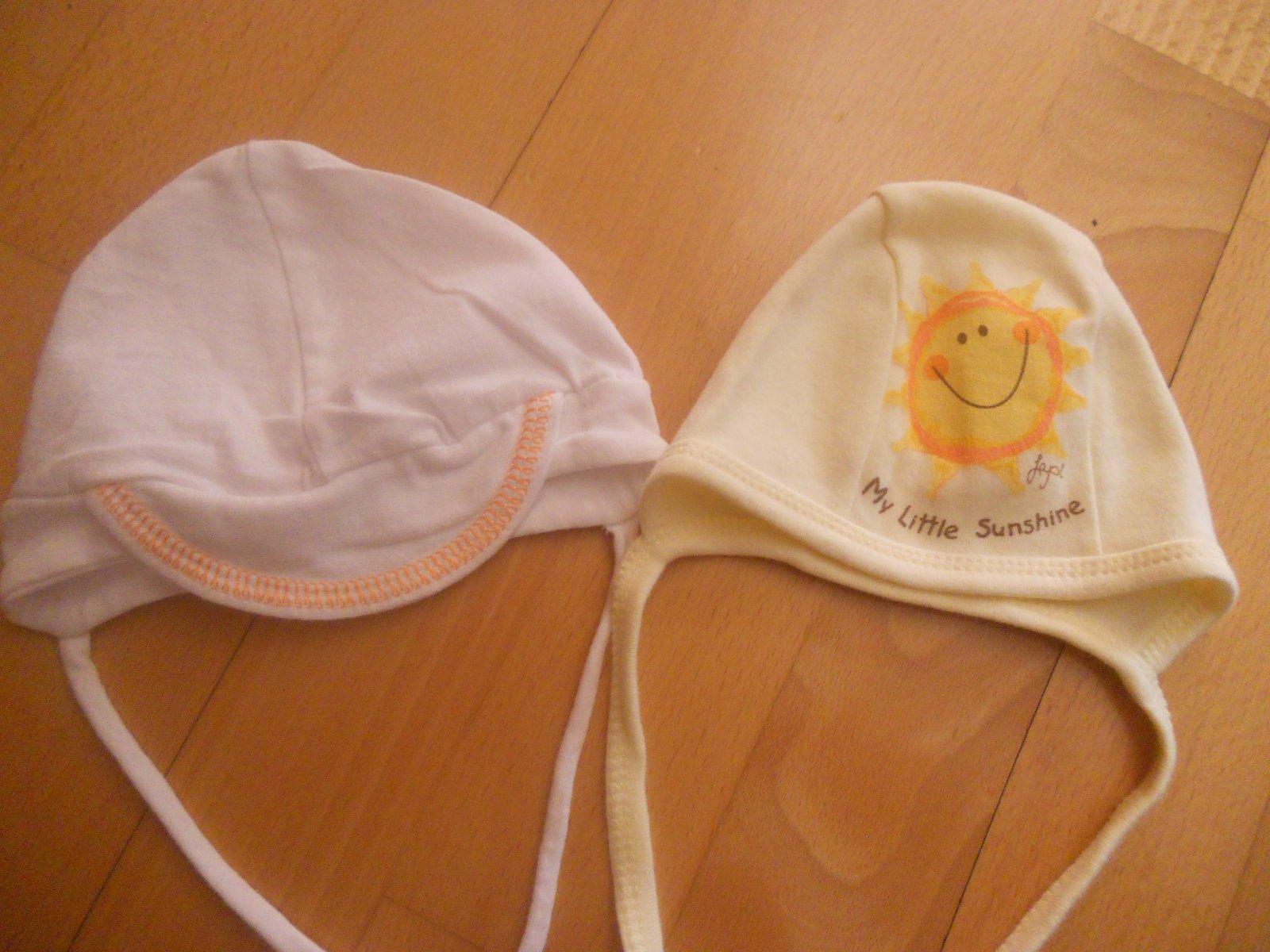 Predám tenké čiapky pre malé bábatká, veľ. odhadom 56. Cena za bielu so šiltom je 1,70 eur a cena za žltú je 2,90 eur.