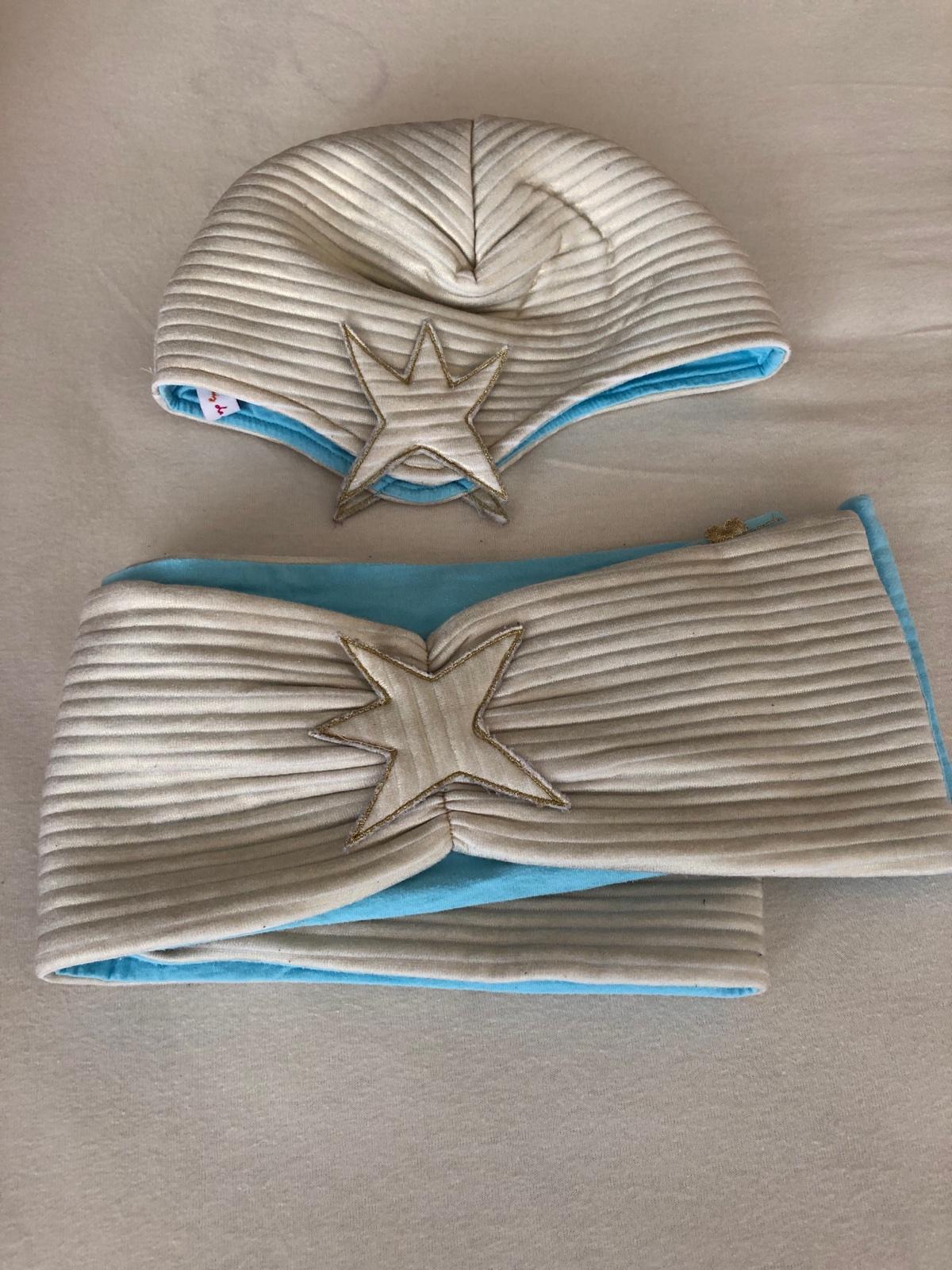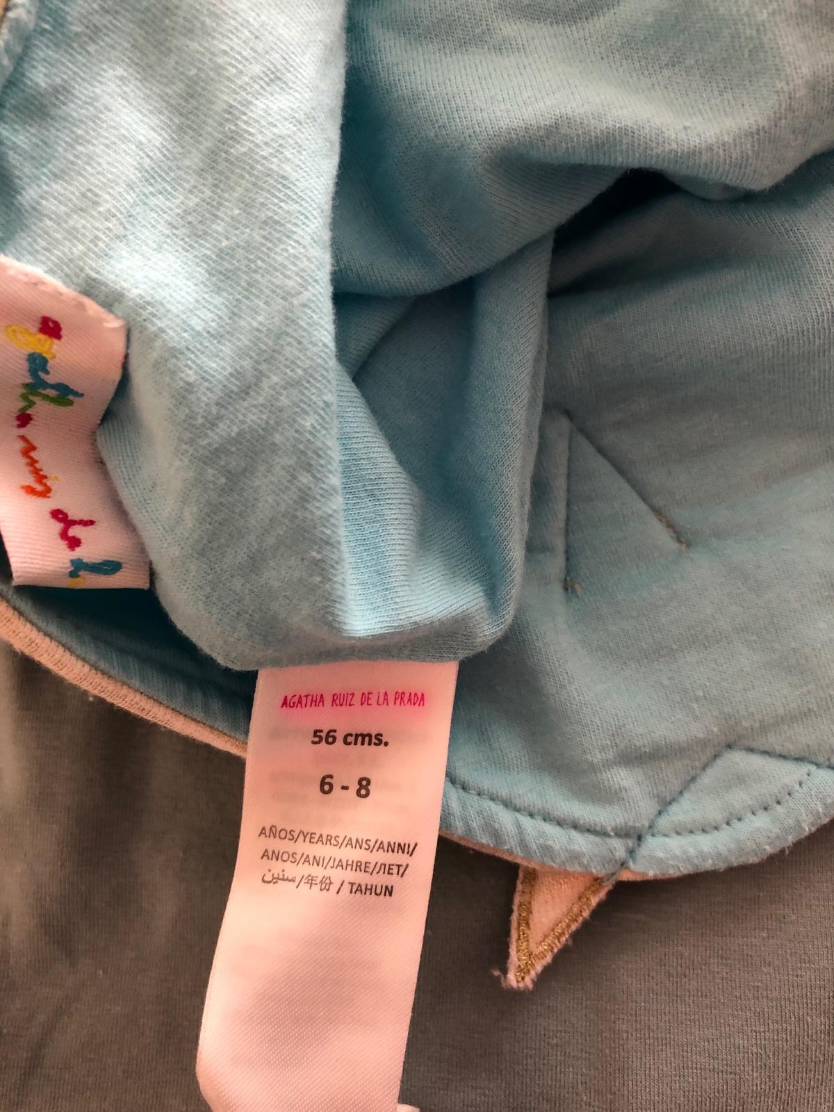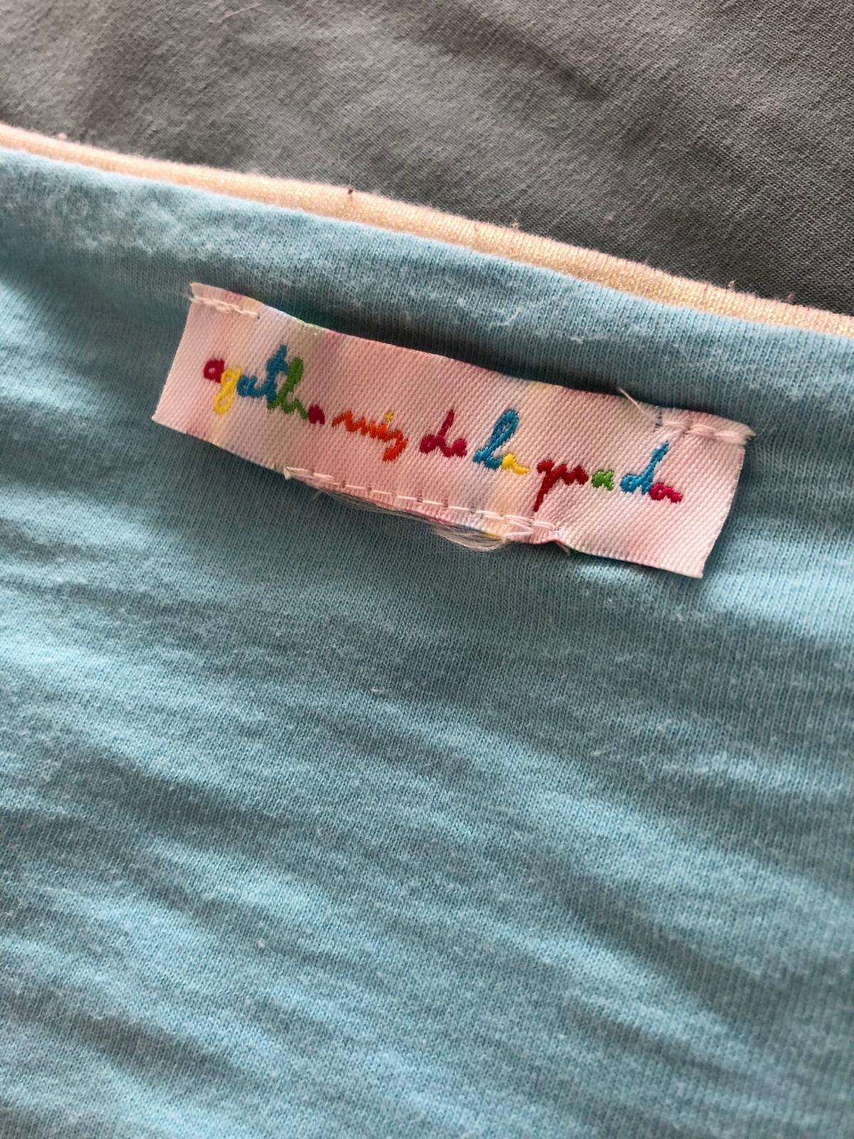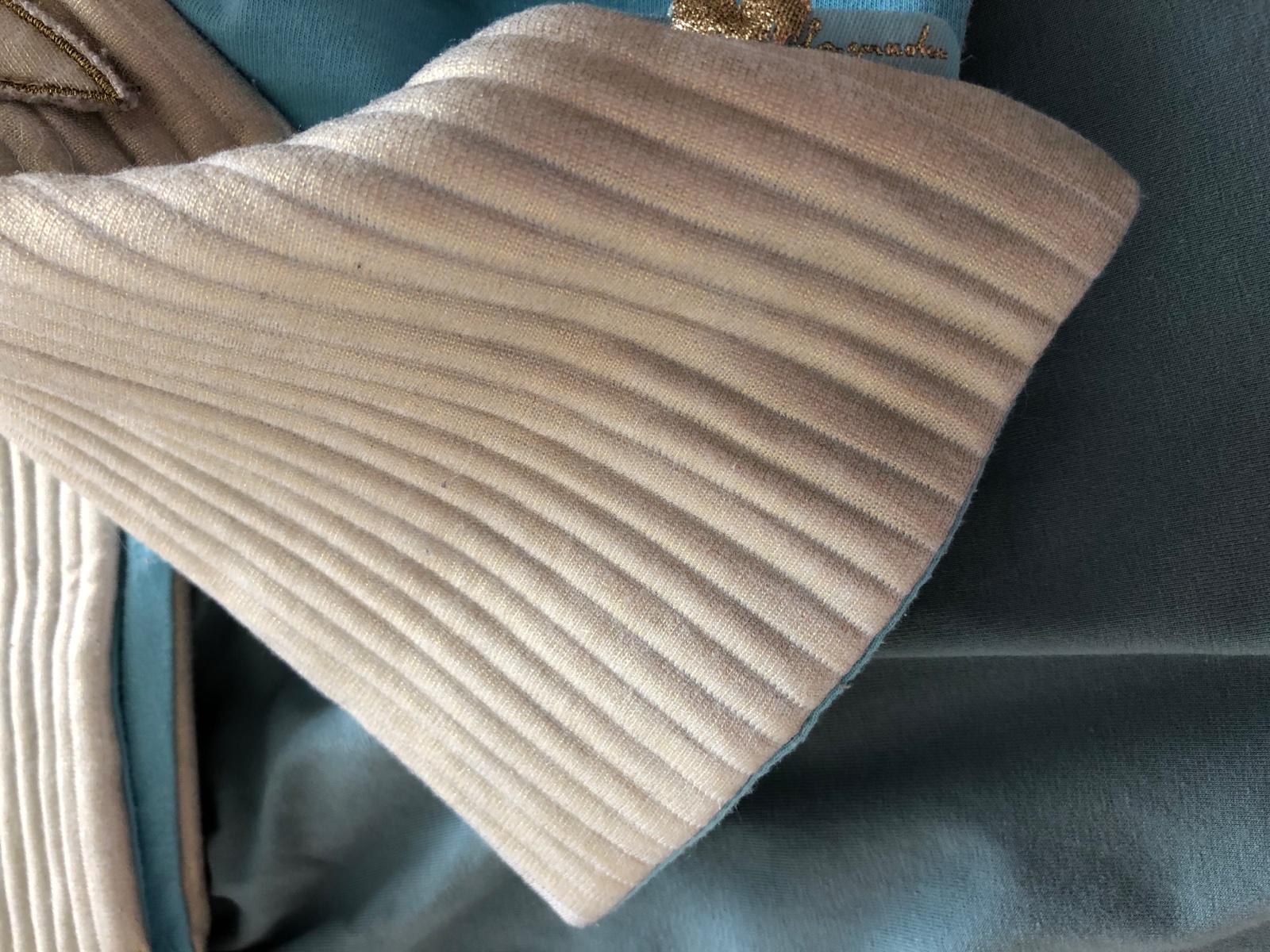 Štýlový krasny set dizajnérskej znacky Agatha de La Prada, pre 6-8 ročne dievcatko. Vnútro krasna tyrkysovo modra bavlnena latka, zvonku zlata metalická latka.