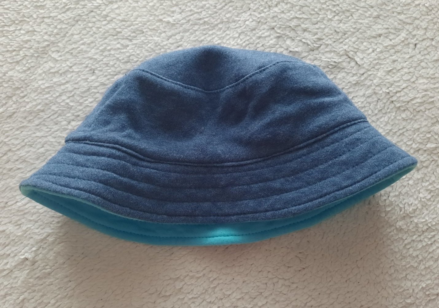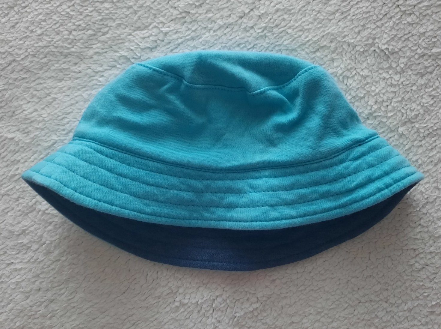 Predám obojstranný klobúčik, značka F&F, farba: tyrkysová / tmavomodrá, veľkosť orientačne 80/86, obvod hlavy 44cm, v peknom zachovalom stave.