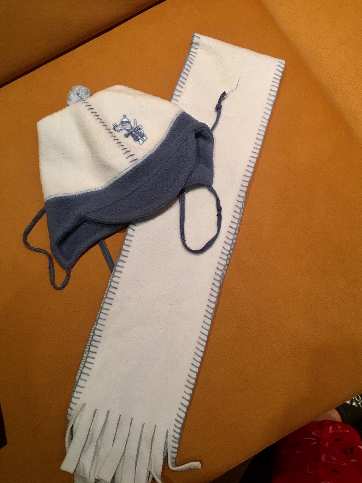 ...zateplená čiapka na šnúrky - dobre drží na ušká... a šál ... bežné známky nosenia (minimálne) za 3 €