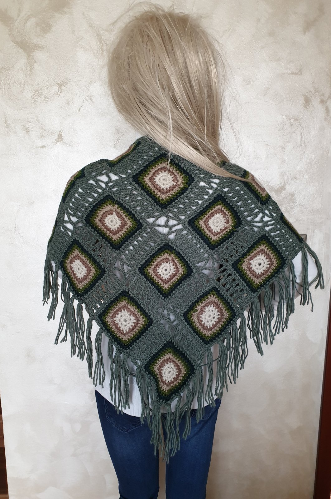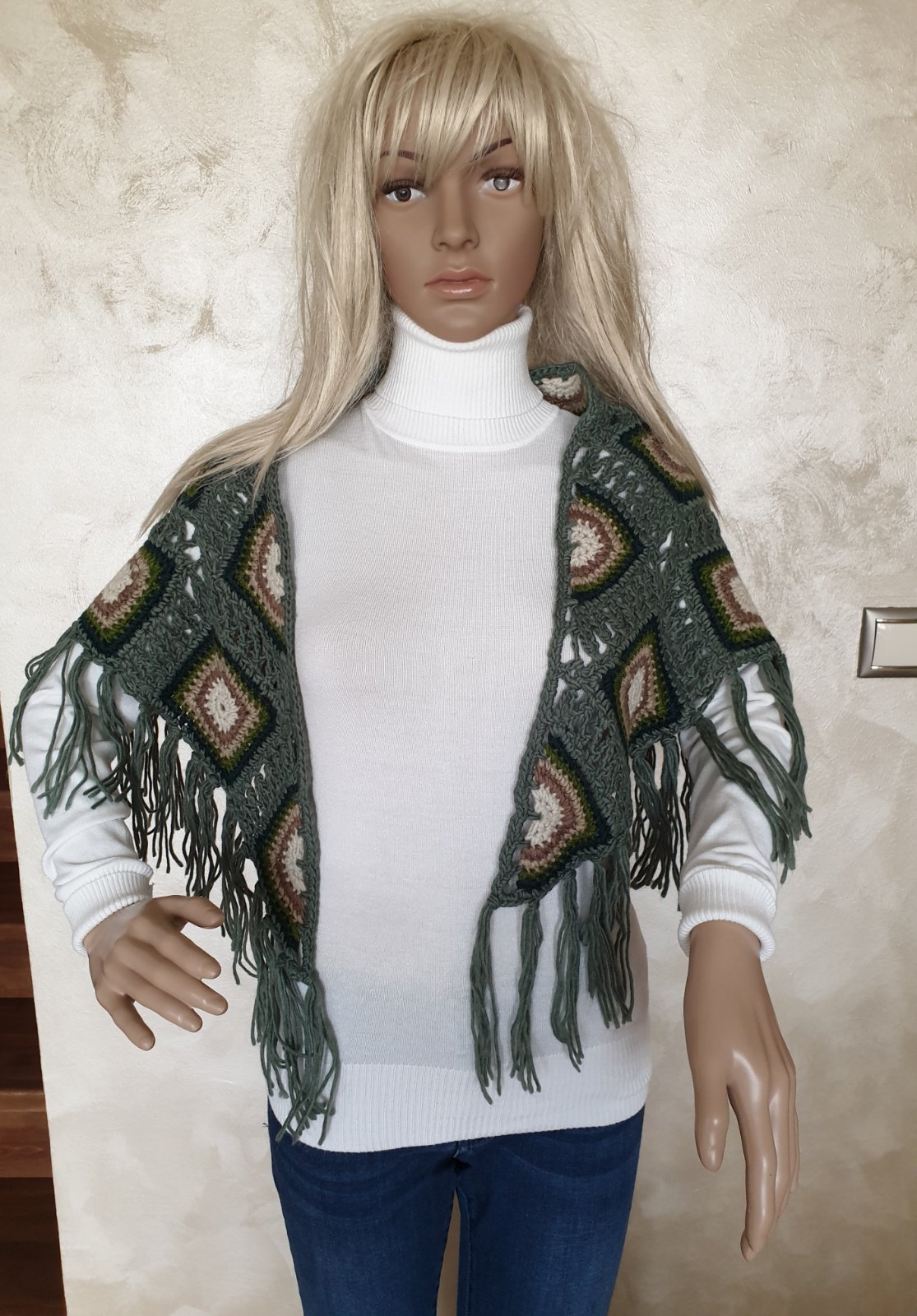 béžová-bordová-tehlová, pretkávaný zlatou, strapčeky, teplý, šíroký cc 44cm, dlhý cez 2m + strapce, veľmi dobrý stav.