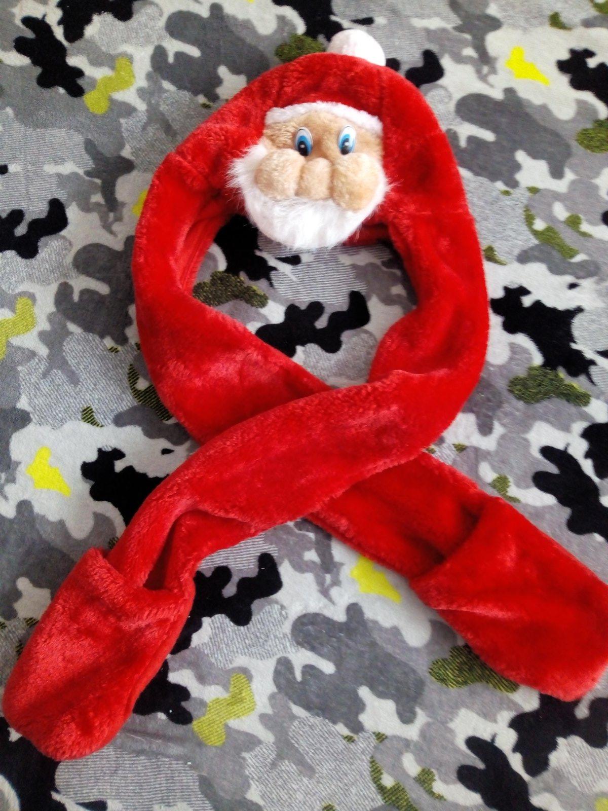 Pekná hrubá čiapka so šálom a Mikuláškom.Nie je uvedená veľkosť.Vhodná na vek 5 -7 rokov