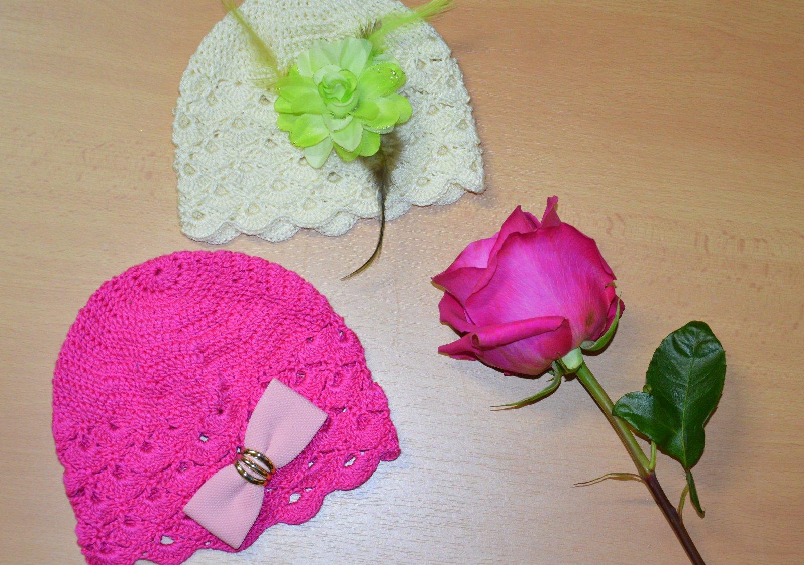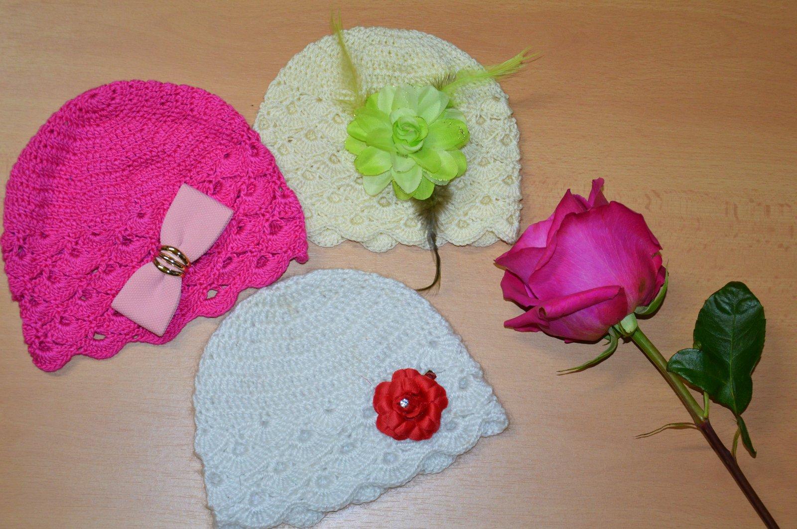 Háčkované čiapočky s veľkými odopínateľnými kvetmi.