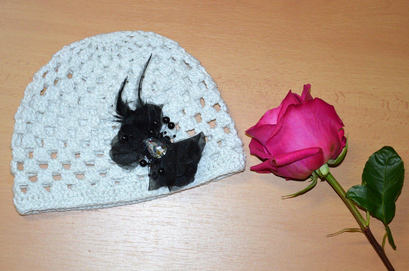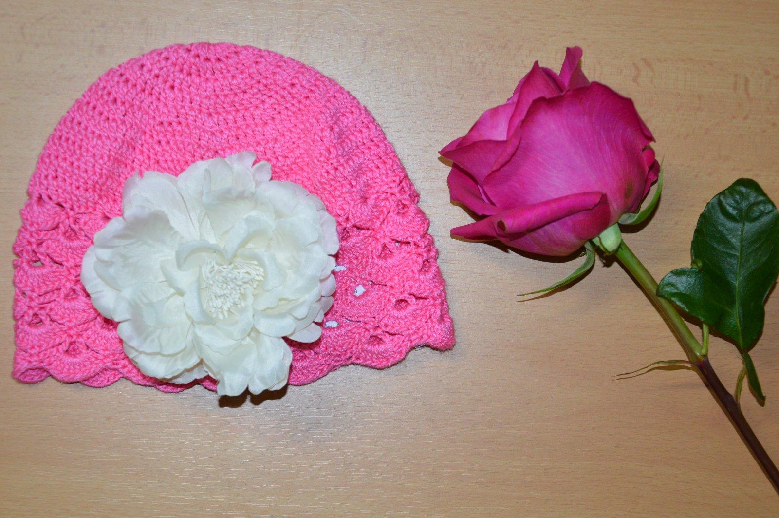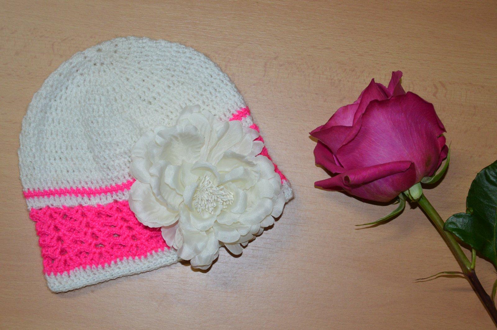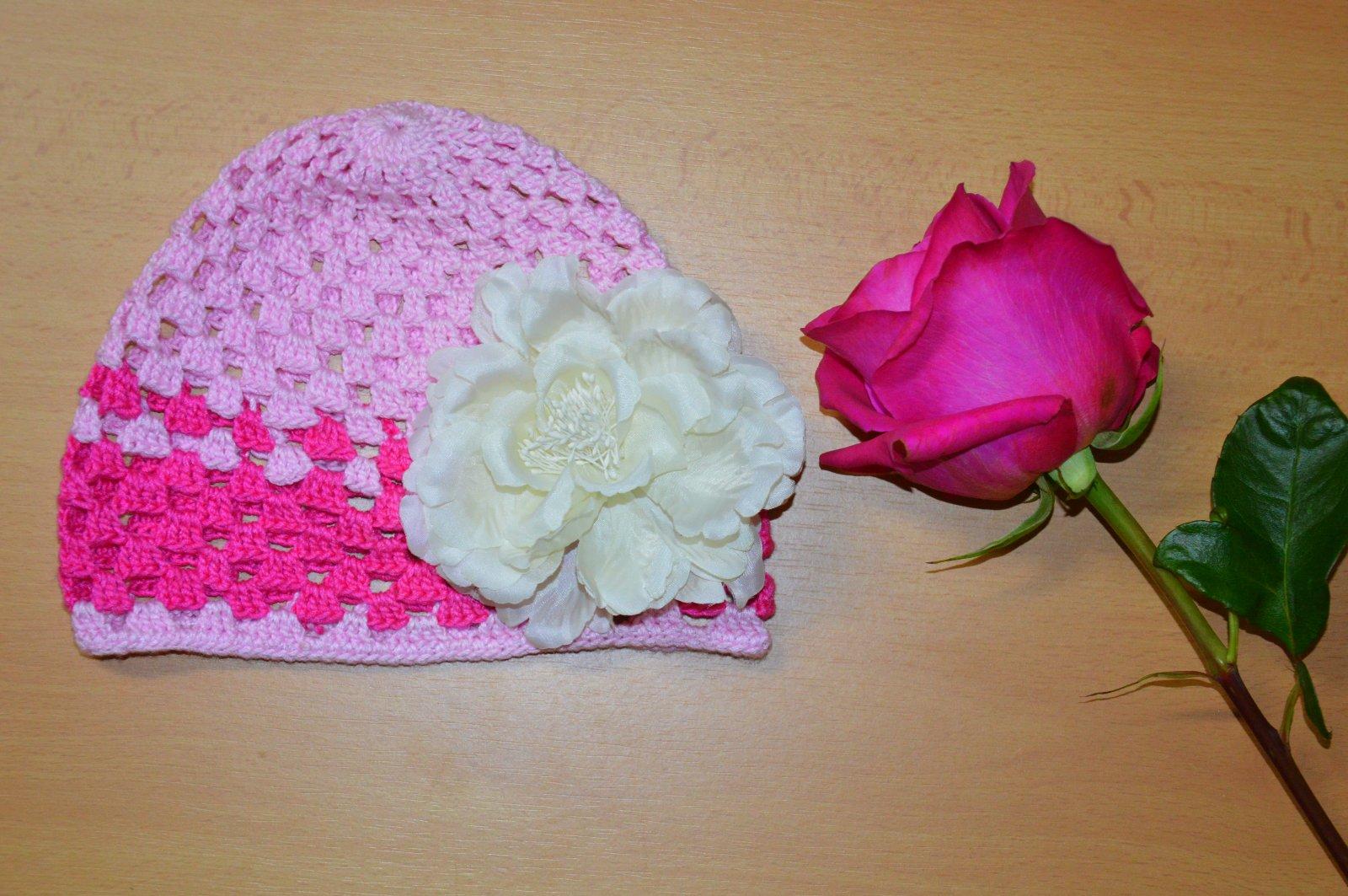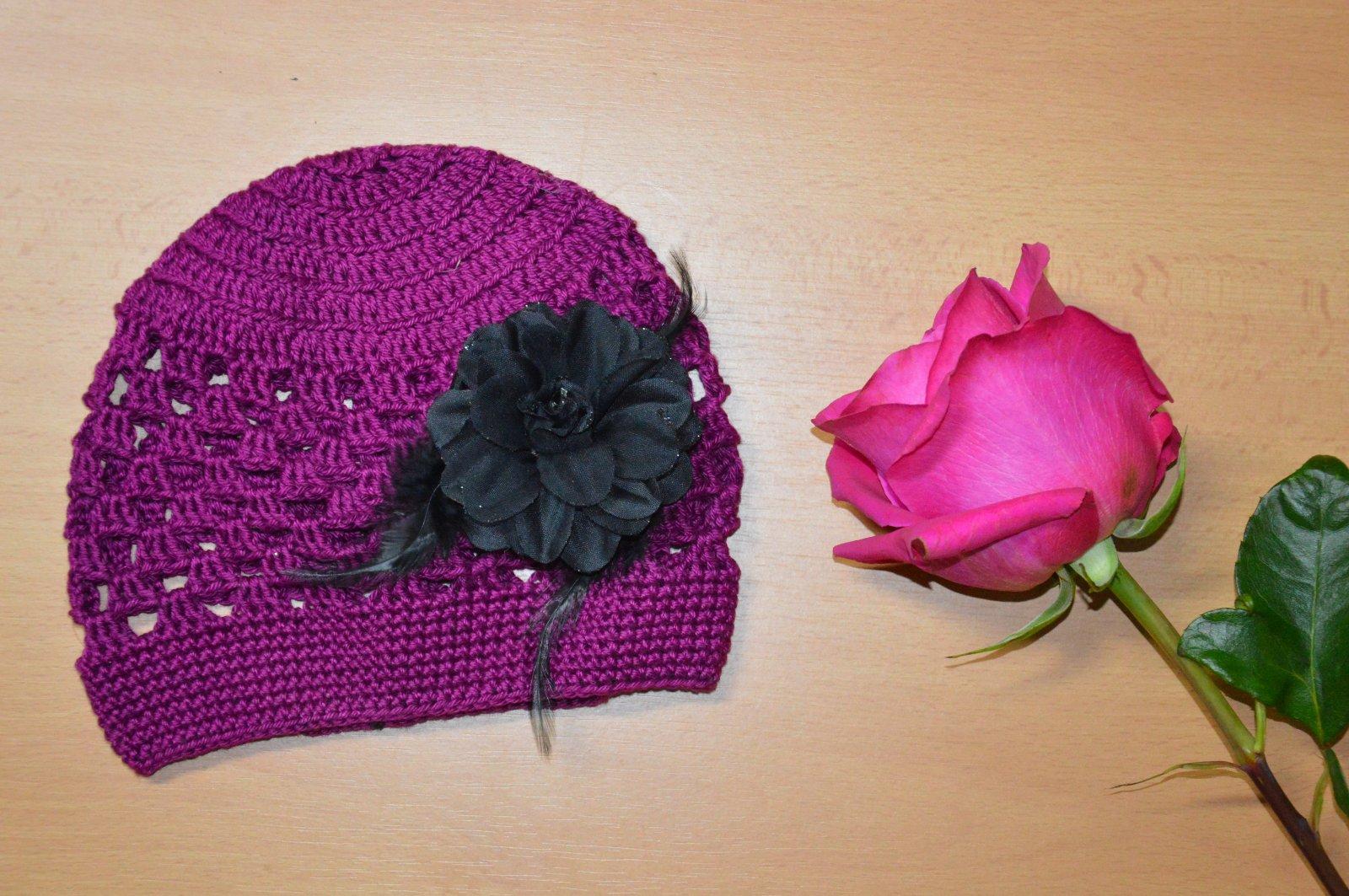 SkladomRučne háčkovaná čiapočka s veľmi pekným vzorom a kvetom.