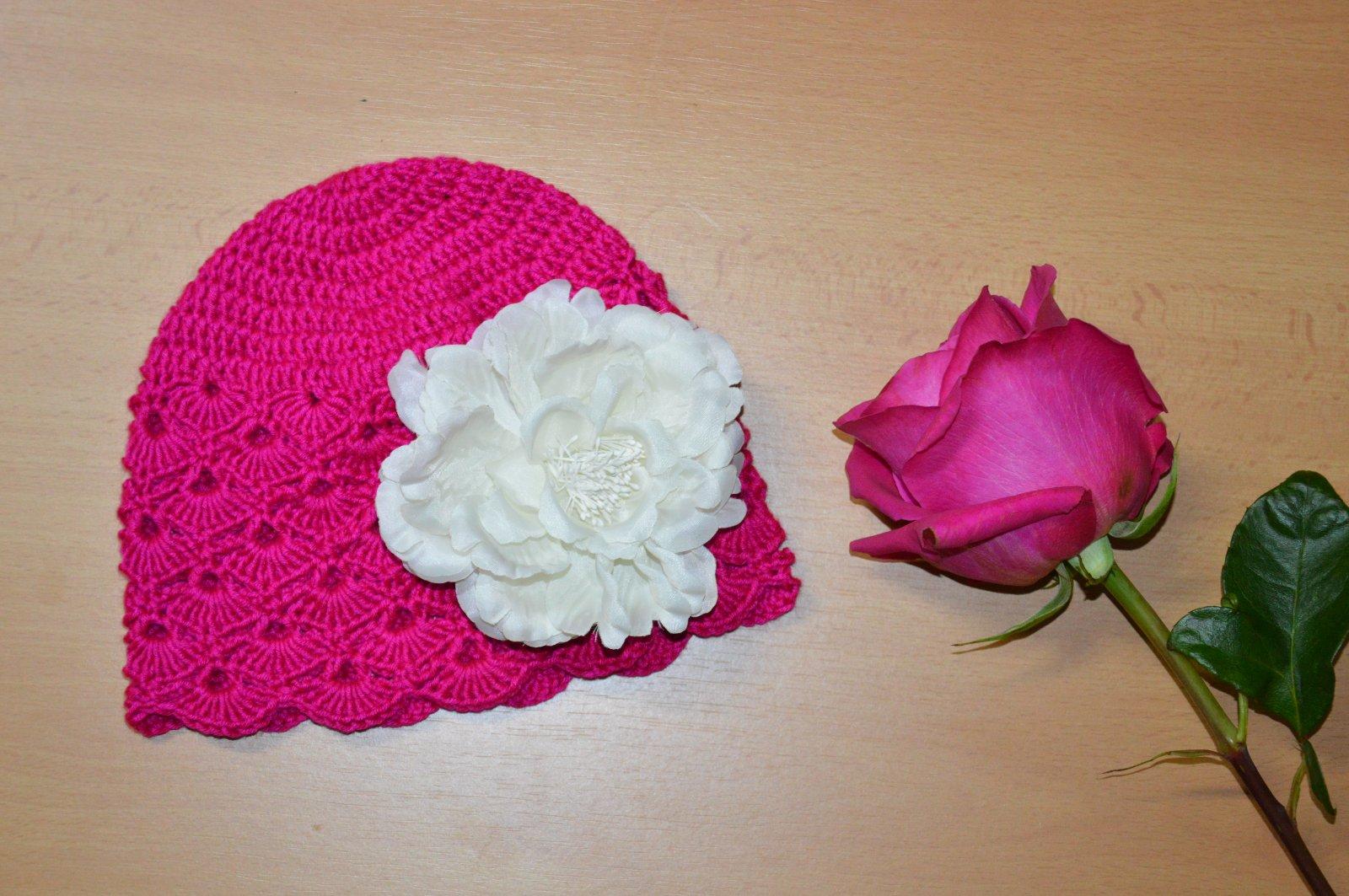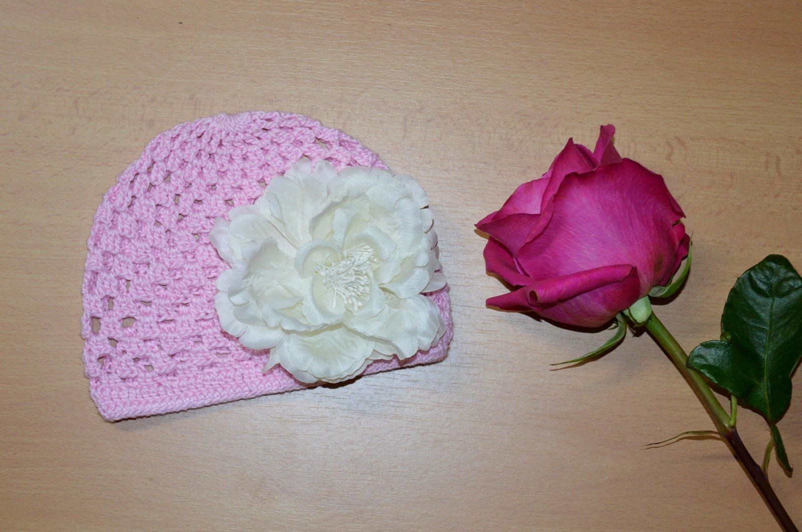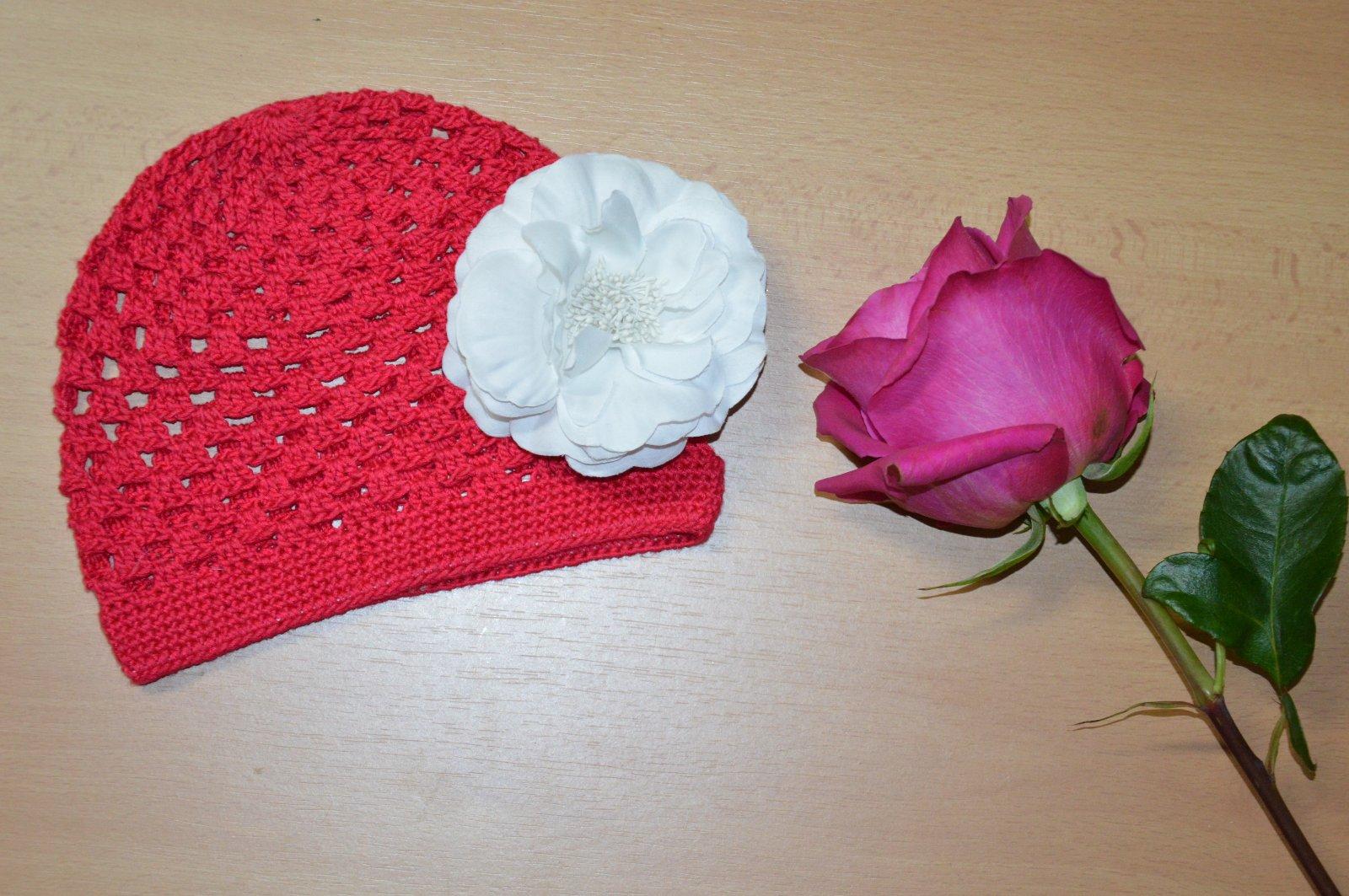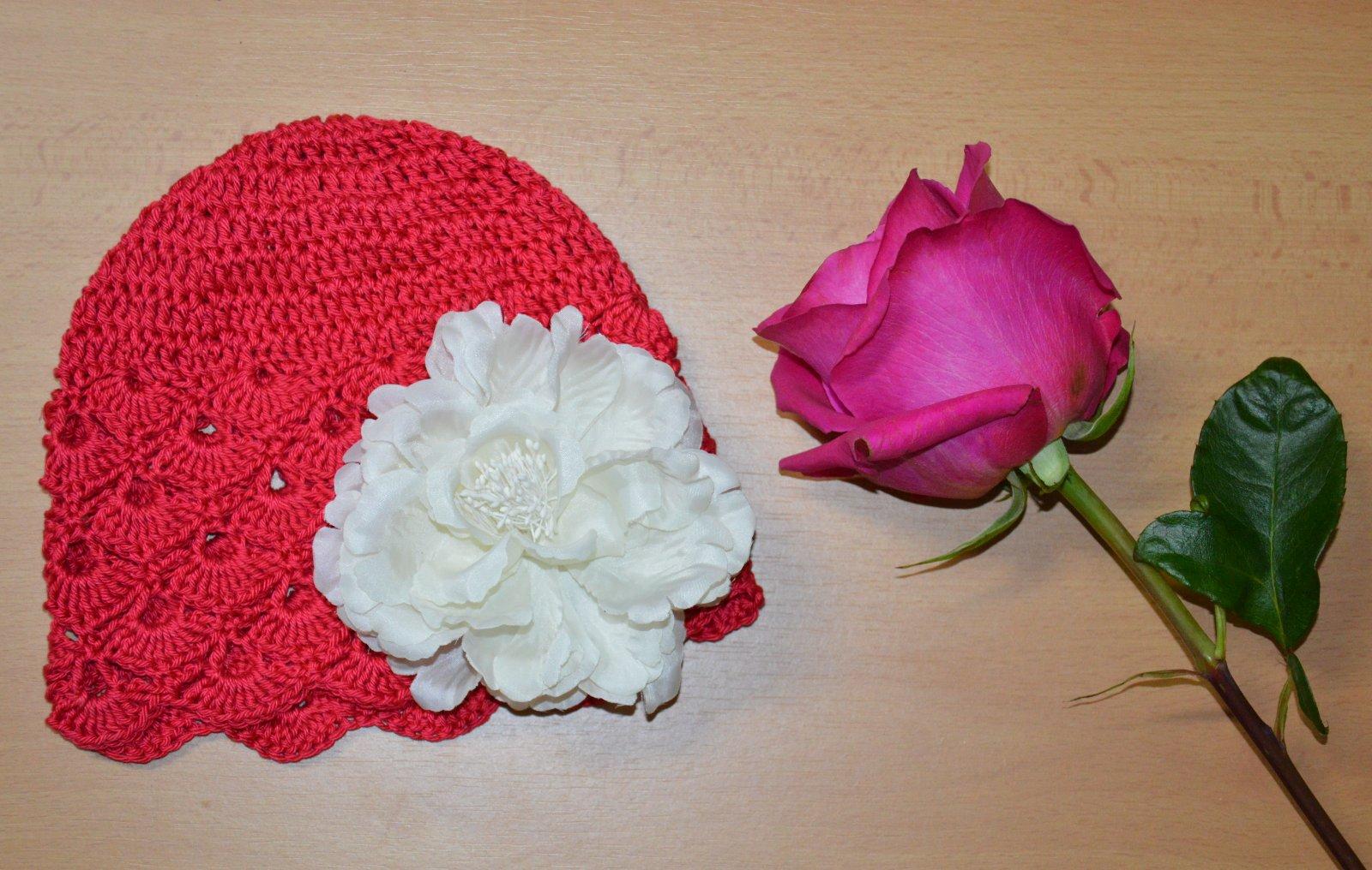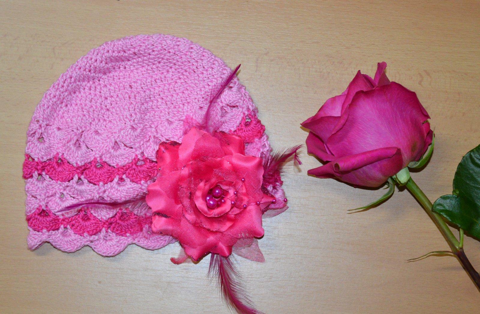 SkladomRučne háčkovaná čiapočka s veľmi pekným vzorom a kvetom.