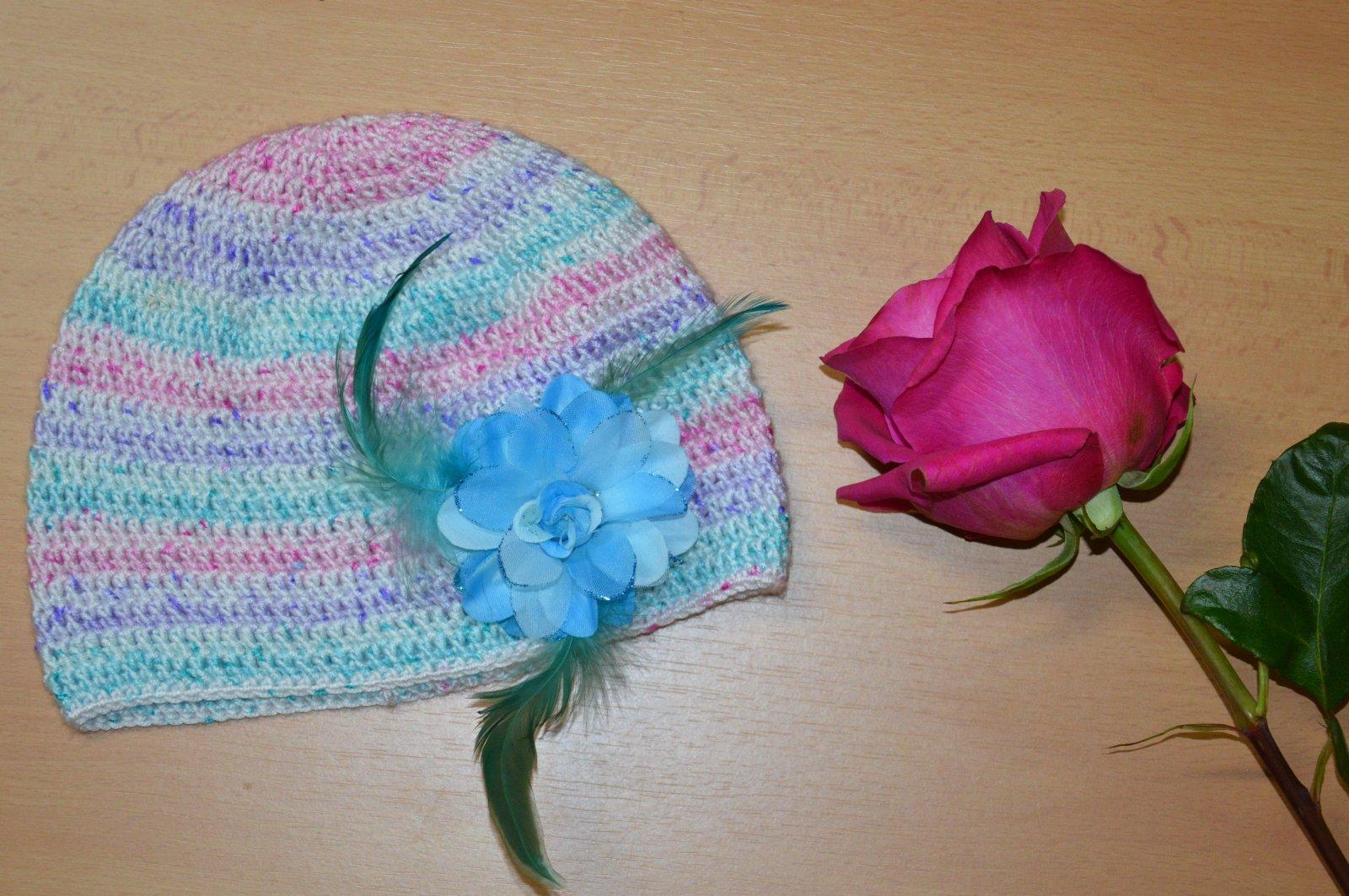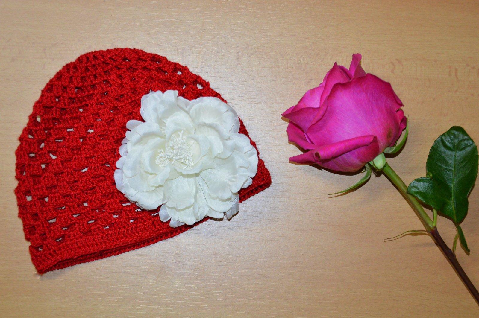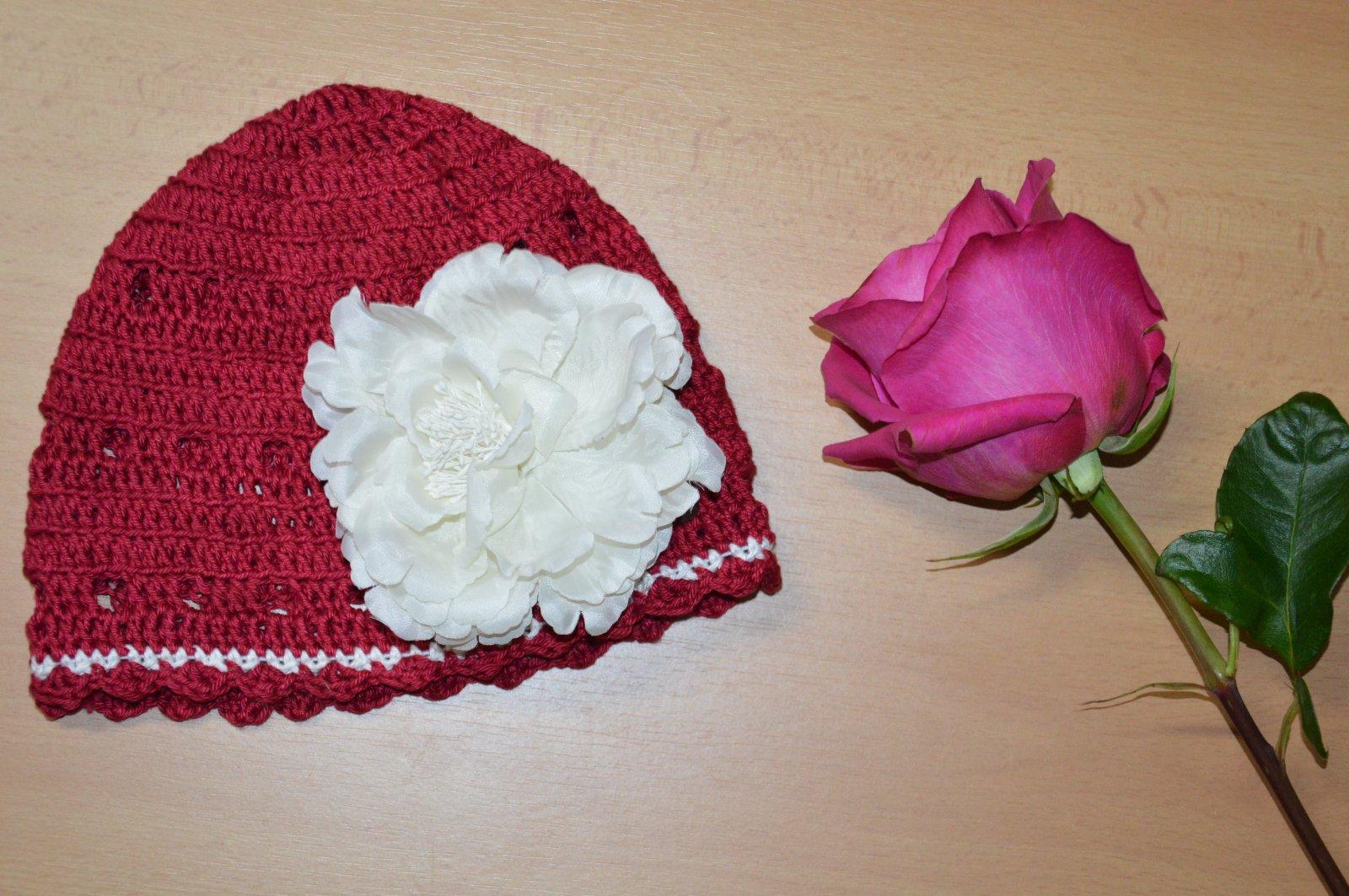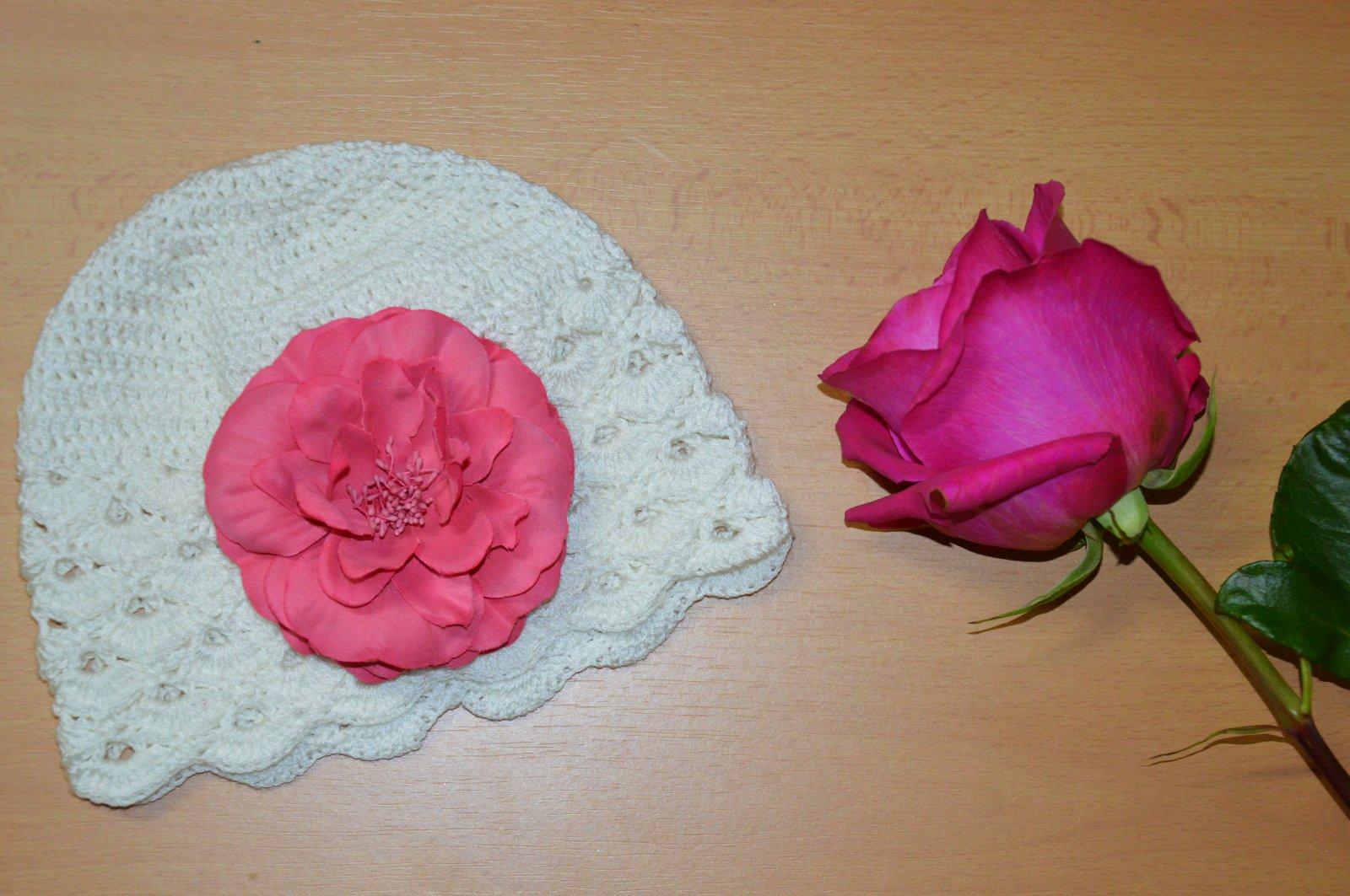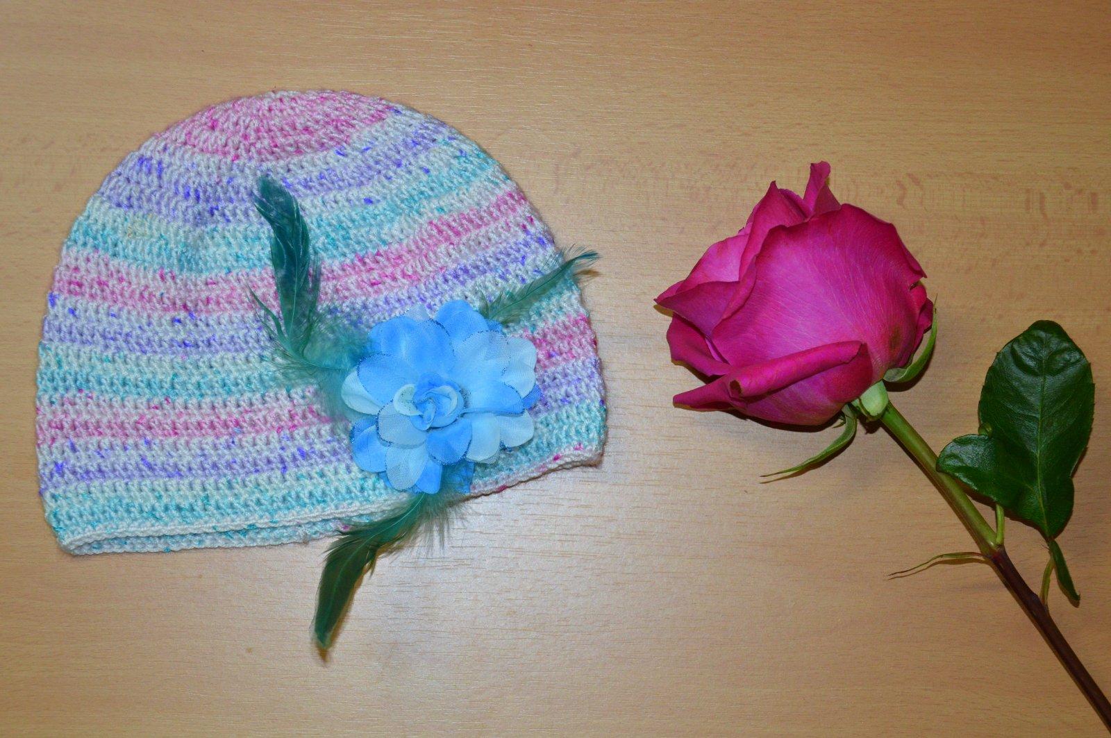 SkladomRučne háčkovaná čiapočka s veľmi pekným vzorom a kvetom.