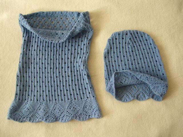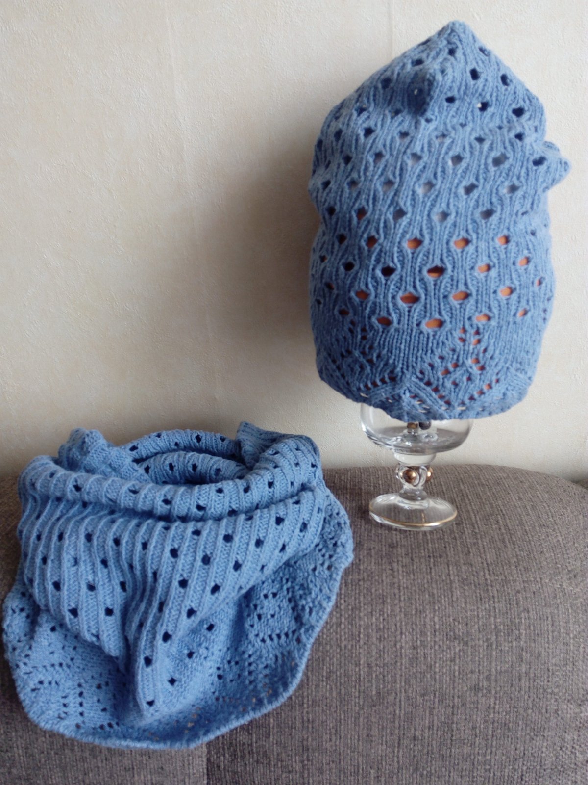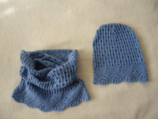 Ciapka aj nakrcnik su z pleteniny, vzor je taky ze su tam oćka, cize vhodne skôr na jar,jesen. Farba modrá trocha s odtieňom fialovej .Obvod ciapky 44-52cm. Vyska ciapky 24cm. Nakrcnik sirka 24x2,este sa napne.Vyska 36cm. Ciapky mam 2 kusy.