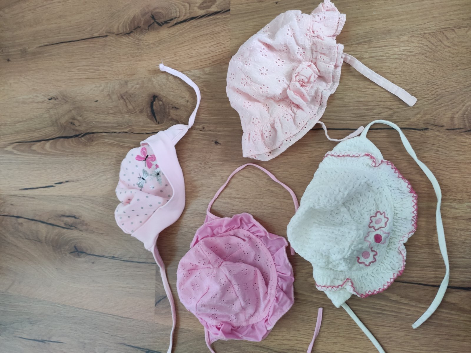 Vyborny stav, bez chybicky. Krasny jemny lanucky letny klobucik. Farba bledo ruzova s plastickym 3D jemnymi bodkami posiatymi po celom klobuciku. Vzadu gumicka - pekne sedi na.hlavocke. Foto s bles...