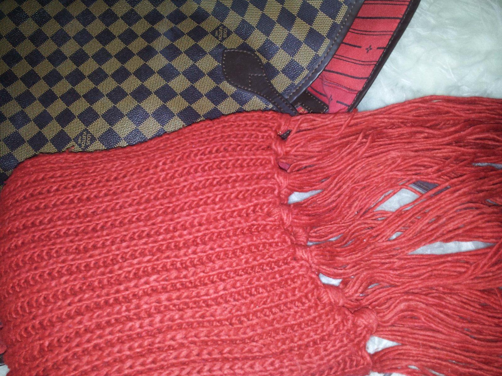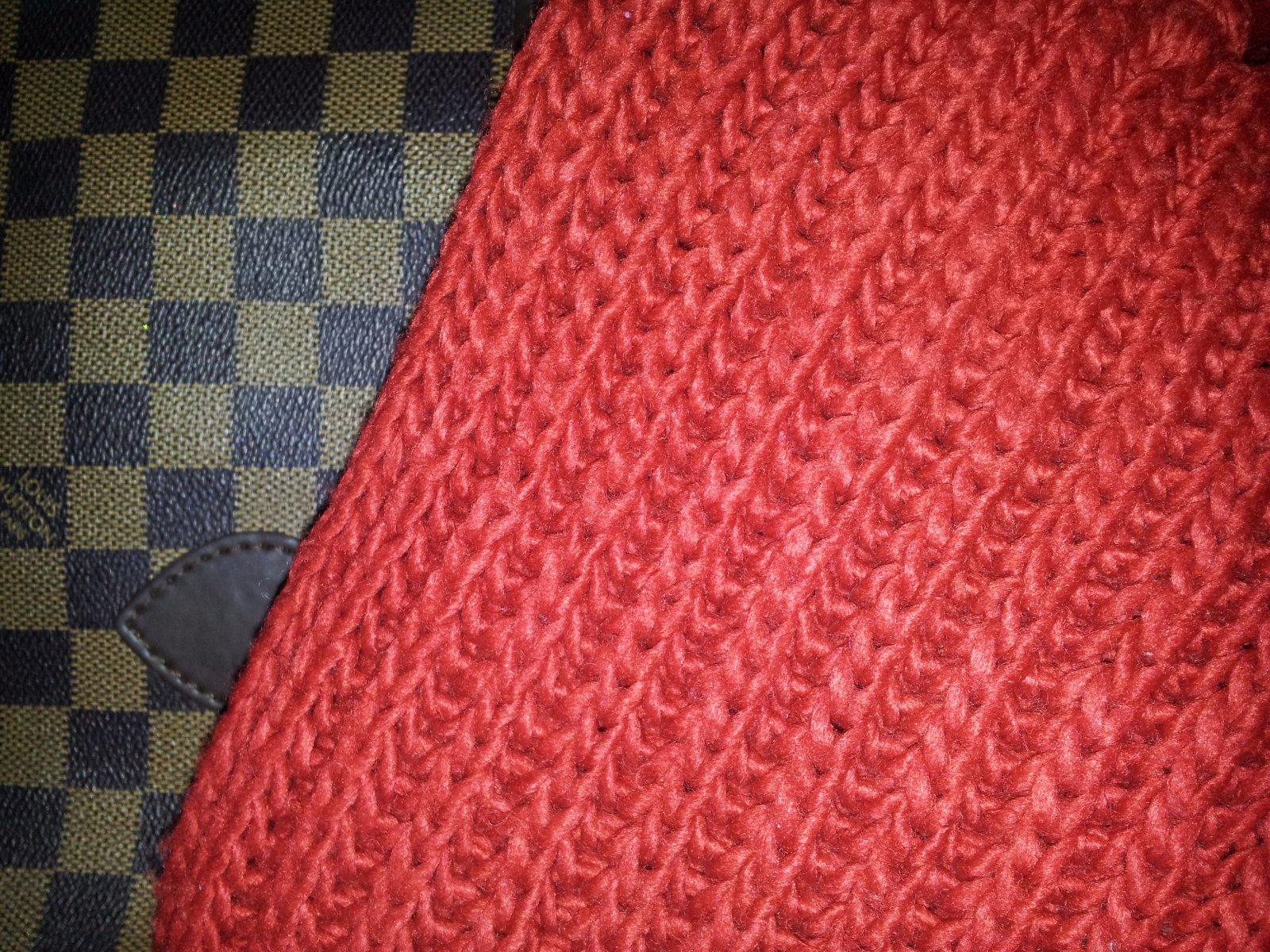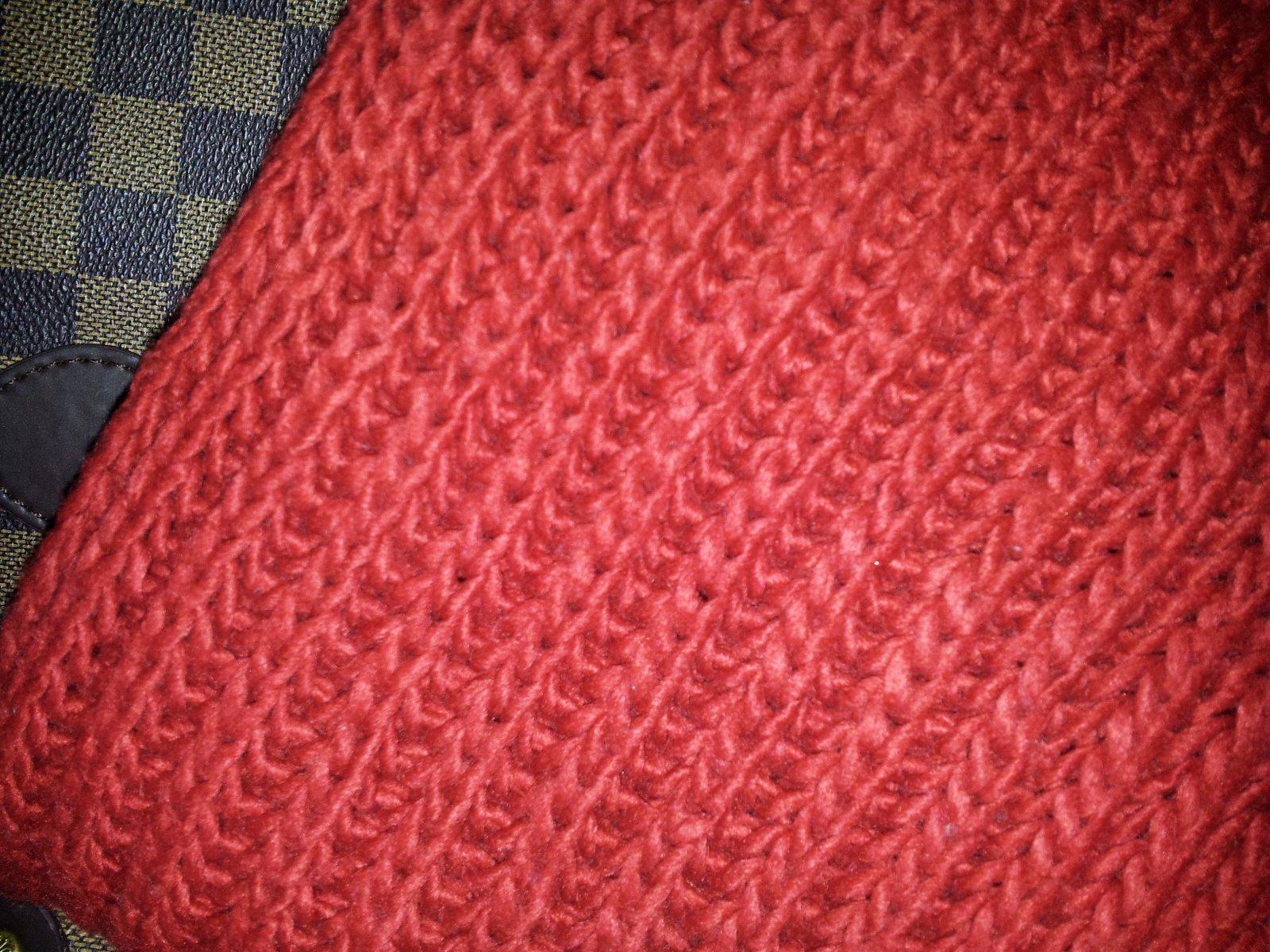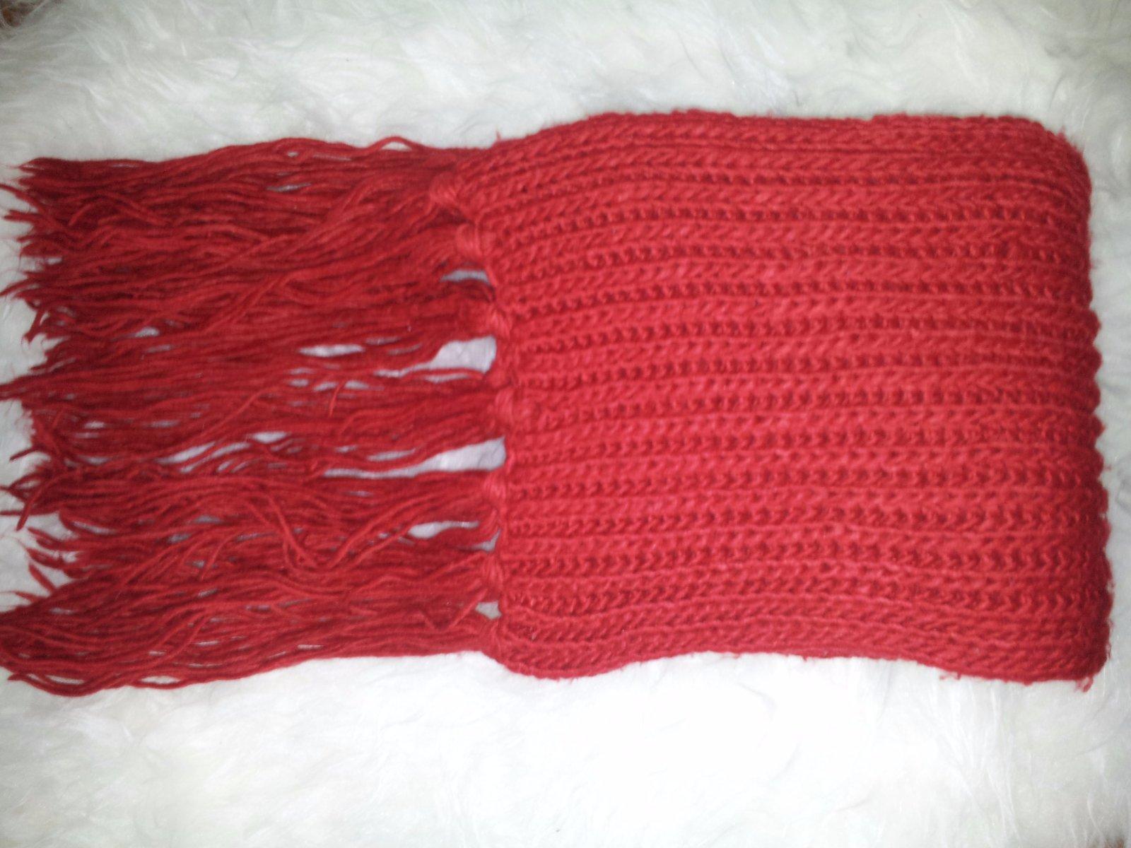 Dámsky červený šál. Kvôli pletenému materiálu môže mať drobné žmolky.