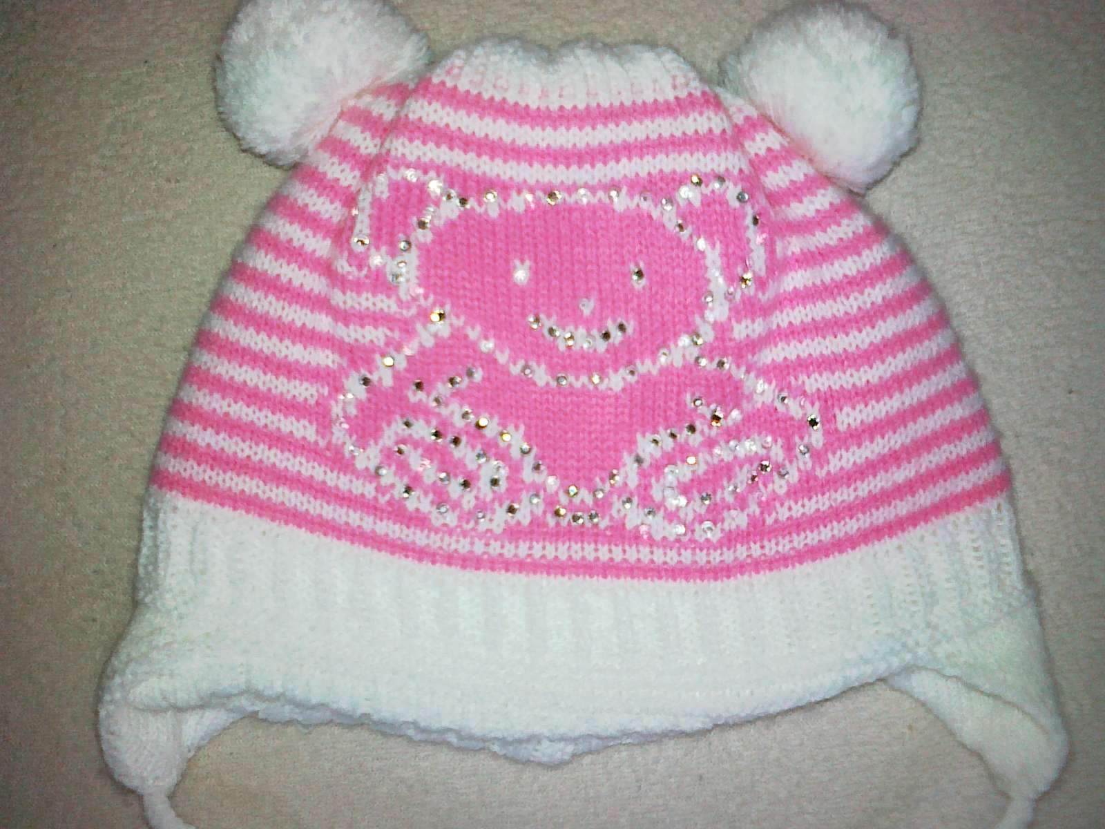 Čiapka je v dobrom nosenom stave,dobre sa poddáva.Obvod v kľud.stave-21cm, natiahnutá-24cm,výška-17cm.Je na viazanie,macko je zdobený s kamienkami.Cena je 2€+pošta.