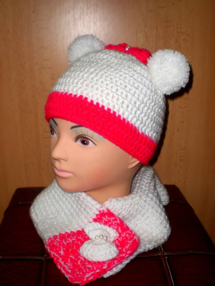 Háčkované čiapočky s bambuľkami a šálom.