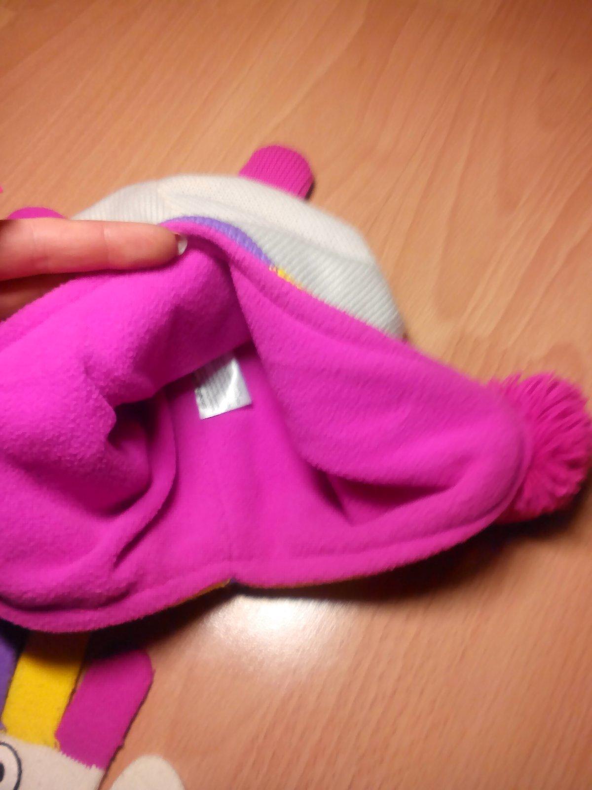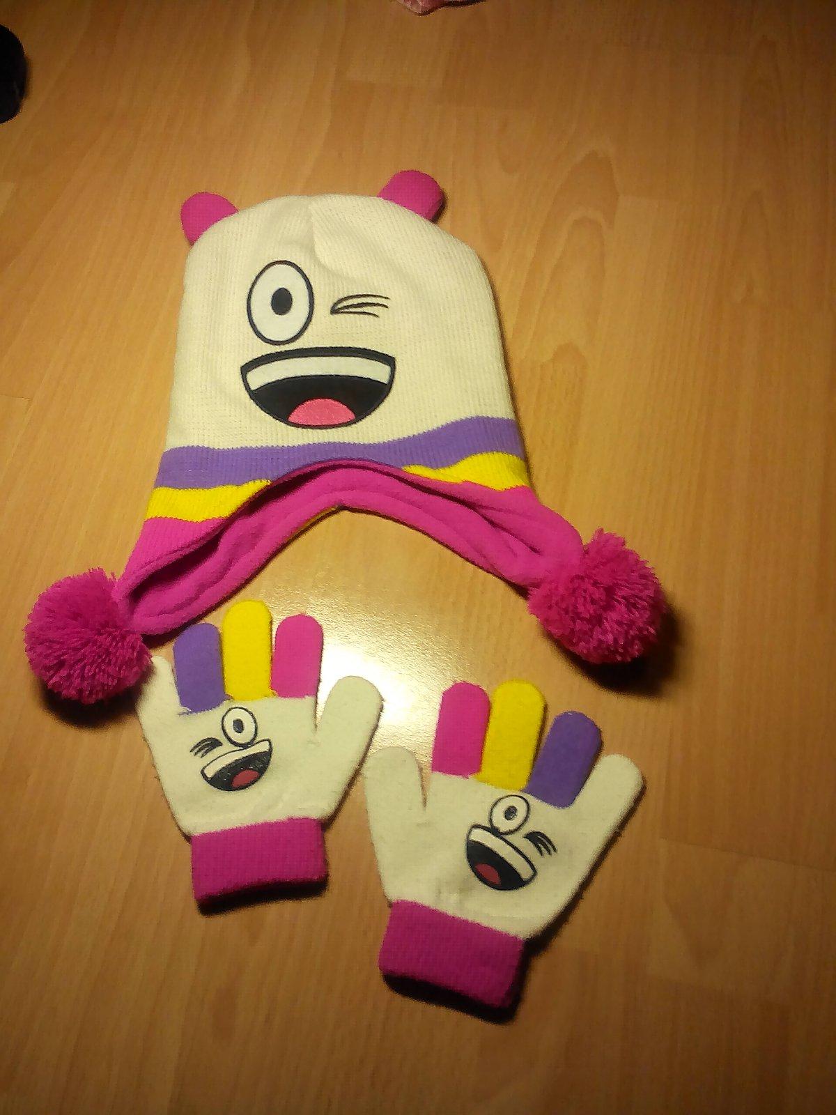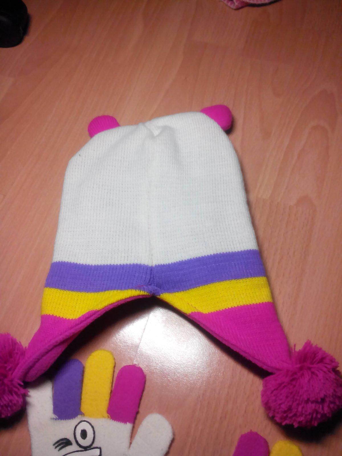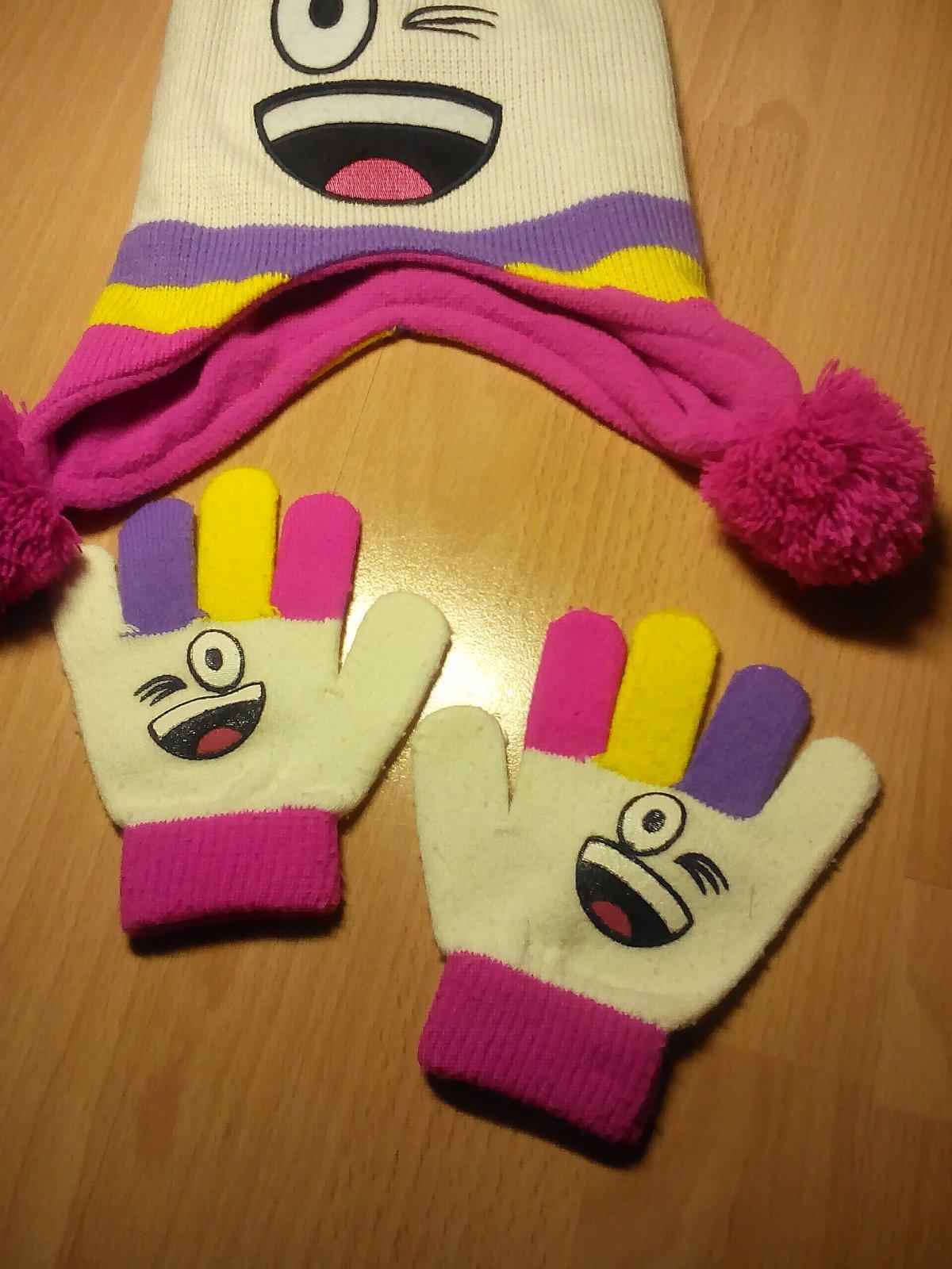 Čiapočka pekná málo nosena nepoškodena rukavičky majú zmolky inak nič ,značka TEDI,obvod bez natiahnutia 21x2 cm povolí na 26x2 cm ,výška 19 cm