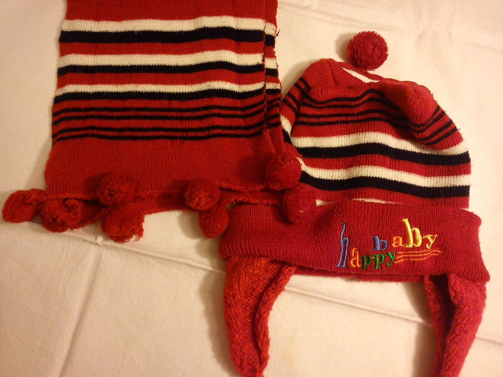 S nápisom Happy baby, na uškách som priplietla trojuholníky, lebo mu stále čiapka padala. Šál dlhý 80cm.