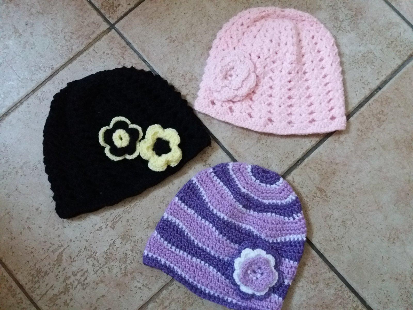 Háčkované čiapočky s veľkými odopínateľnými kvetmi. Vhodné pre dievčatká na jarné obdobie. Materiál: priadza, ručná práca. Farba: fialová , ružová na gumičku s rôznym farebným kvetom podľa vlastnéh...