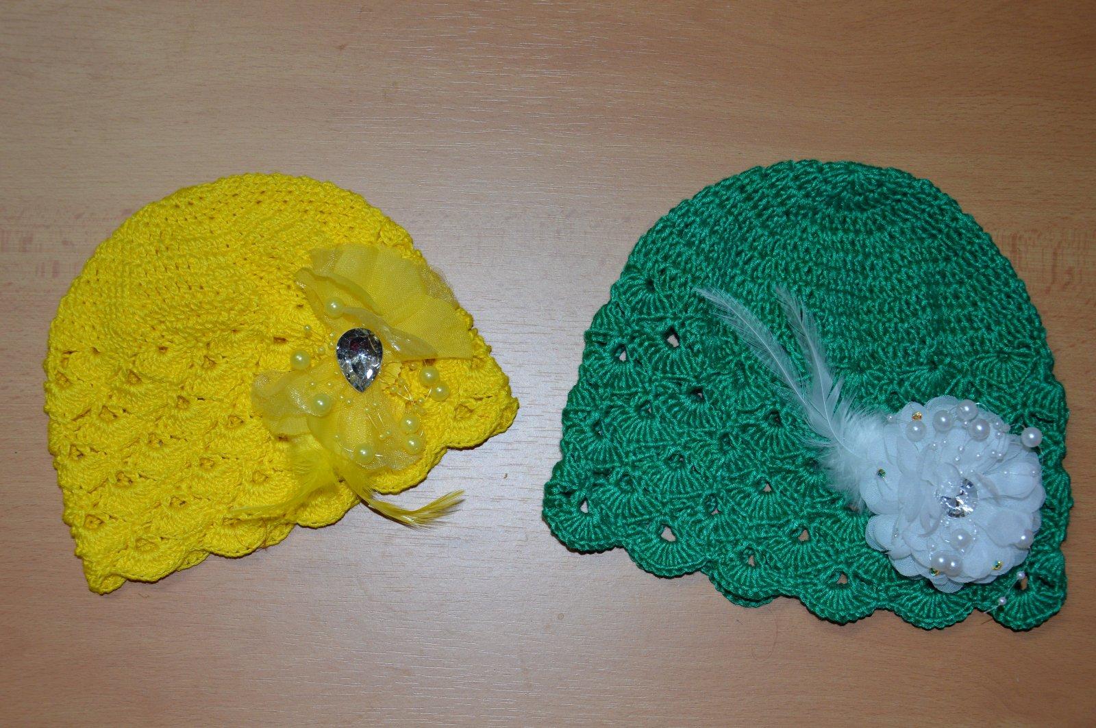 Háčkované čiapočky s veľkými odopínateľnými kvetmi.