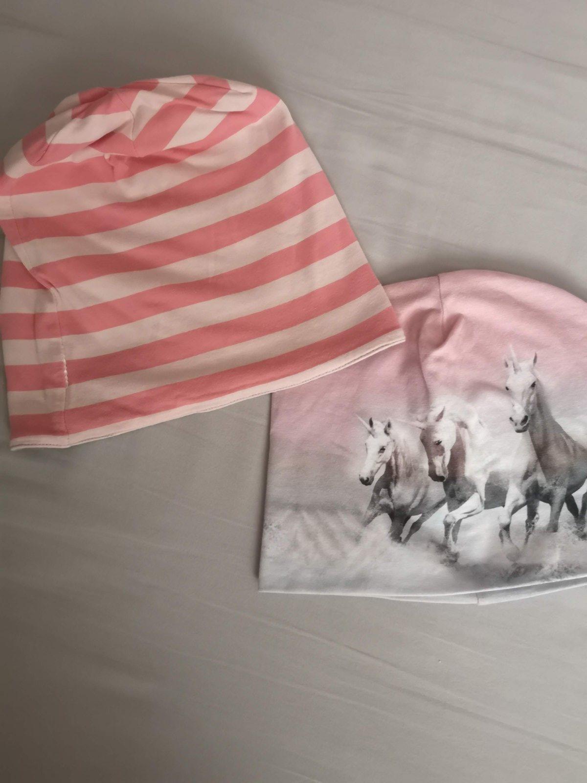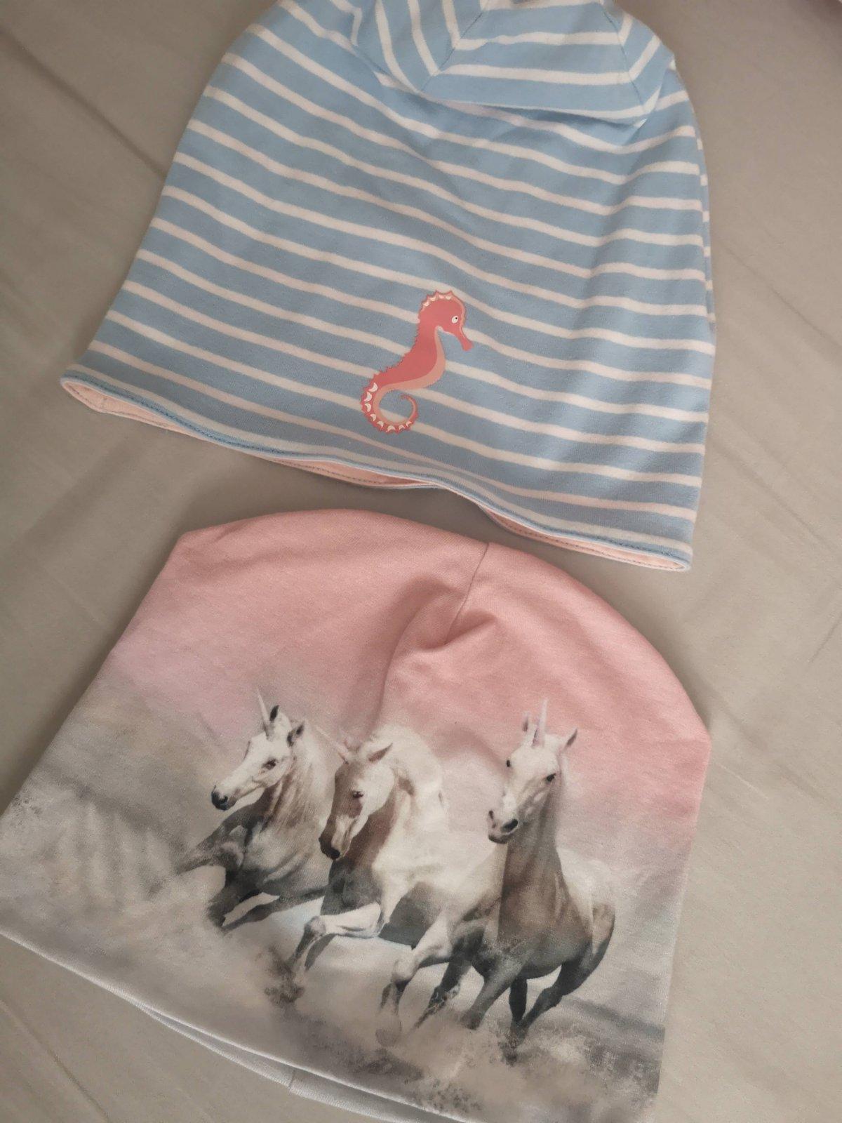 Dve jarné čiapočky, s koníkmi H&M, druhá obojstranná Tchibo s morským koníkom alebo pruhovaná. Cena za obe. Rozmery na foto. Bio bavlna, príjemný materiál. Bezchybné, pekné.