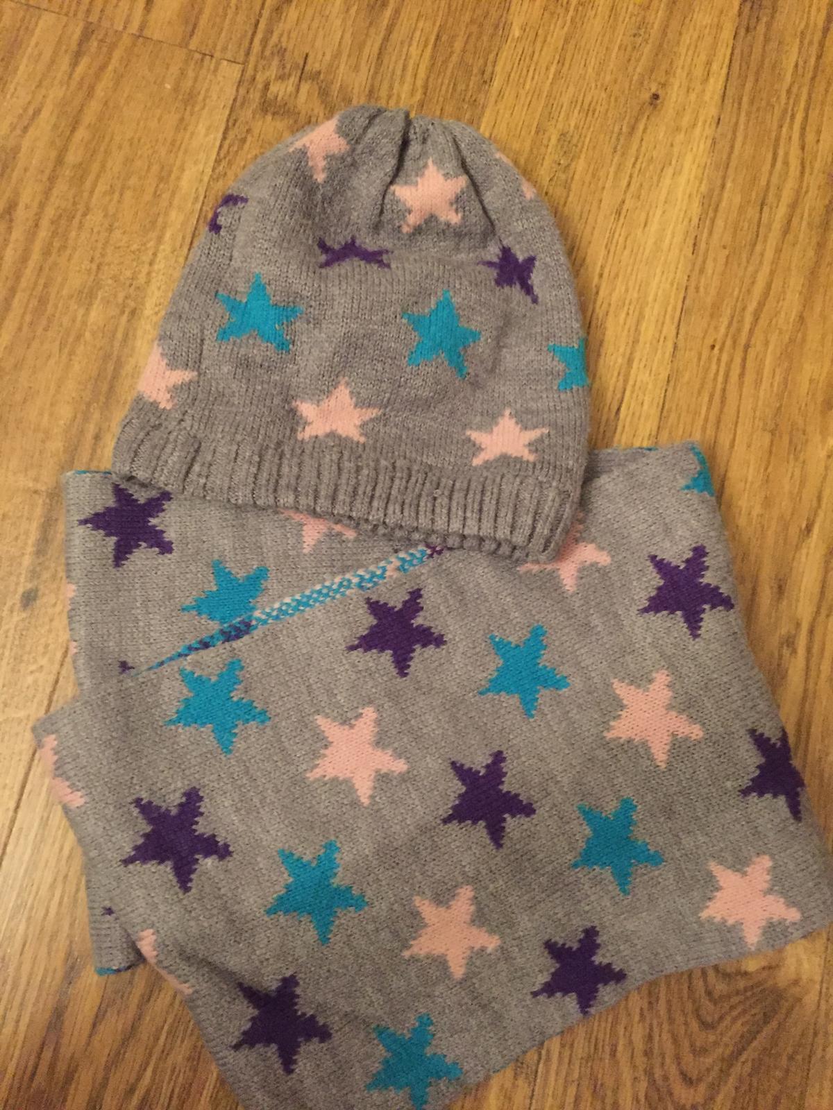Skvelý setík od zn. H&M s trendy farebnými hviezdičkami. Čiapka má uvedenú veľkosť 134/152, šálik je tunelového typu - uni veľkosť. Setík je nosený, v super stave, na šáliku jemné žmolky - vidieť p...