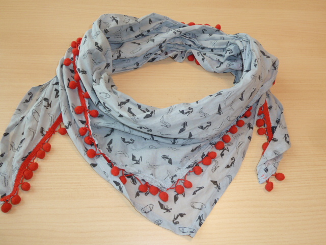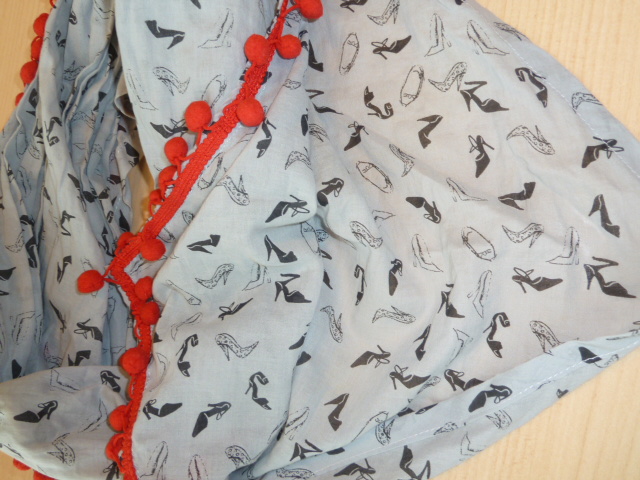 Pekné červené brmbolce okolo celej šatky, potlač sú topánky na opätku, veľmi príjemný materiál