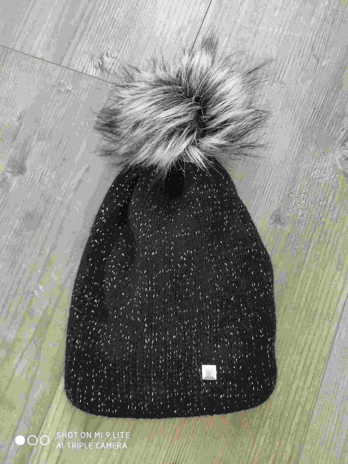 krasna cierna ciapka presivana striebornymi nitkami a s velkym sedy brmbolcom . ciapka je hruba resp, dvojita , idealna na zimu. velkost UNI, elasticka
