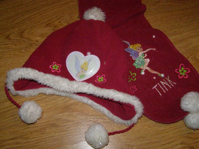 Ponúkam krásny Disney set čiapka + šál s obrázkom Zvonilky. Veľkosť je od 2-4 rokov, aspoň my sme tento set takto nosili na striedačku s inými. Po vypratí ostali na šále nalepené mini chumáčiky z kožušiny, ale dá sa to zozbierať (viď foto).