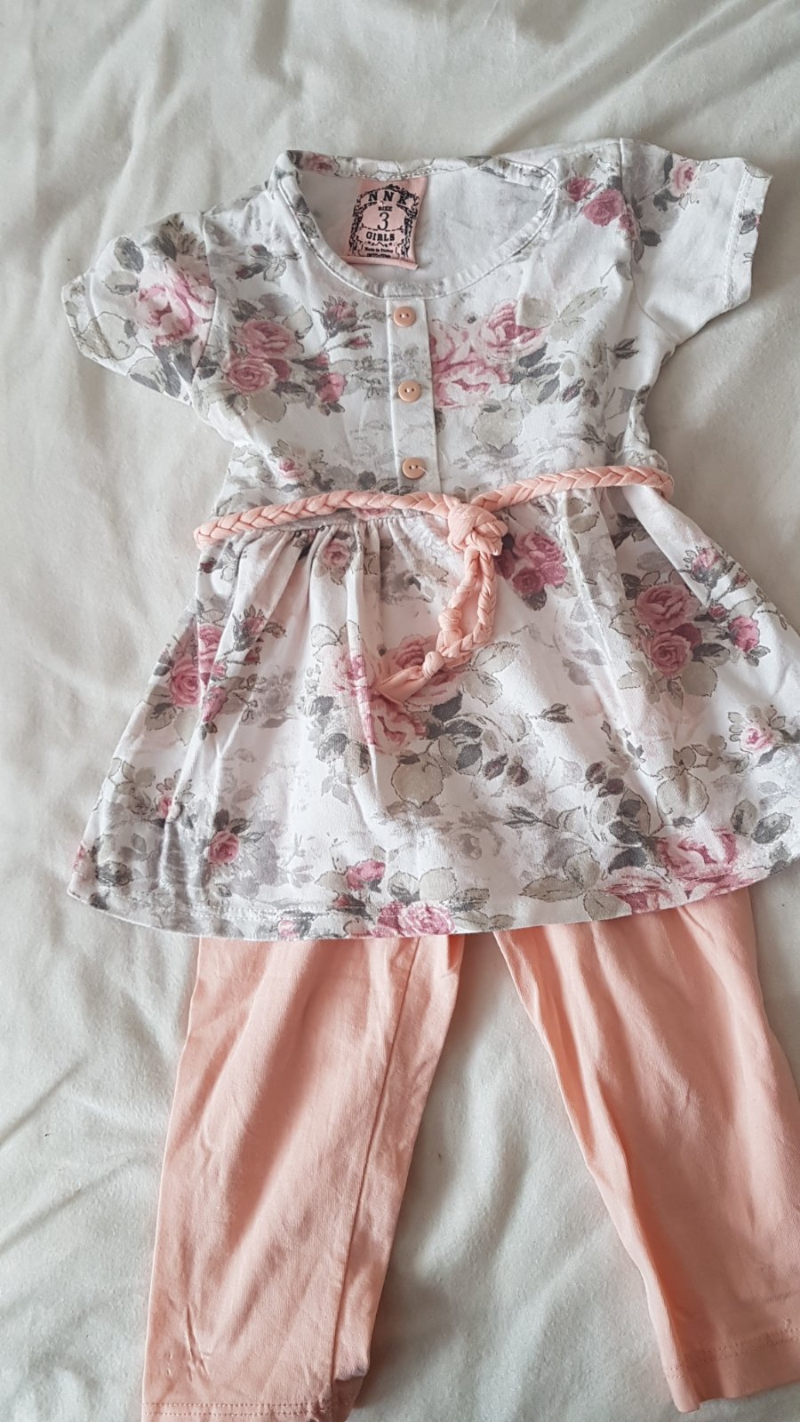 Krásny kompletík-tričko krásne kvetované s opaskom vo farbe legín a legínky sú v takej marhuľkovej farbe. Všetko bavlnené. Nie je ani zničené, lebo dcérka to nosila len príležitostne. Nie je uvedená veľkosť, ale my ame to nosili keď potrebovala veľkosť 74. V prípade záujmu premeriam.