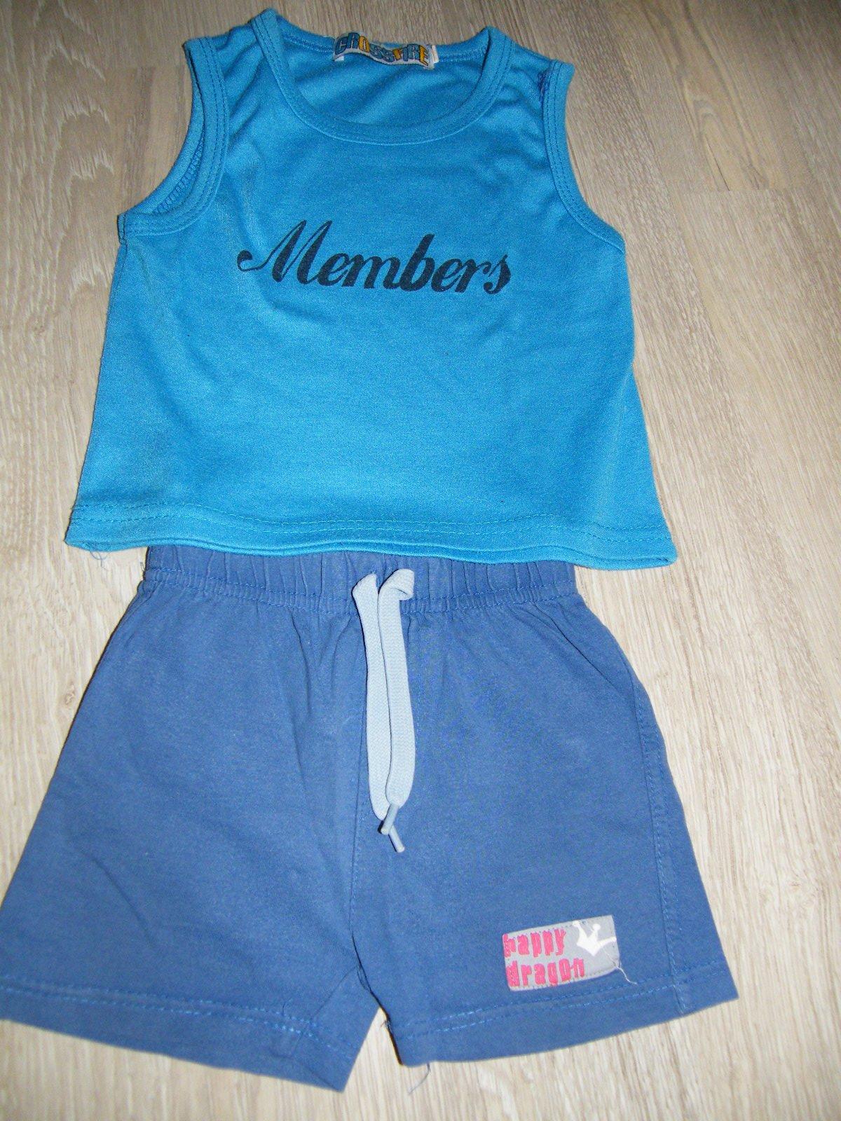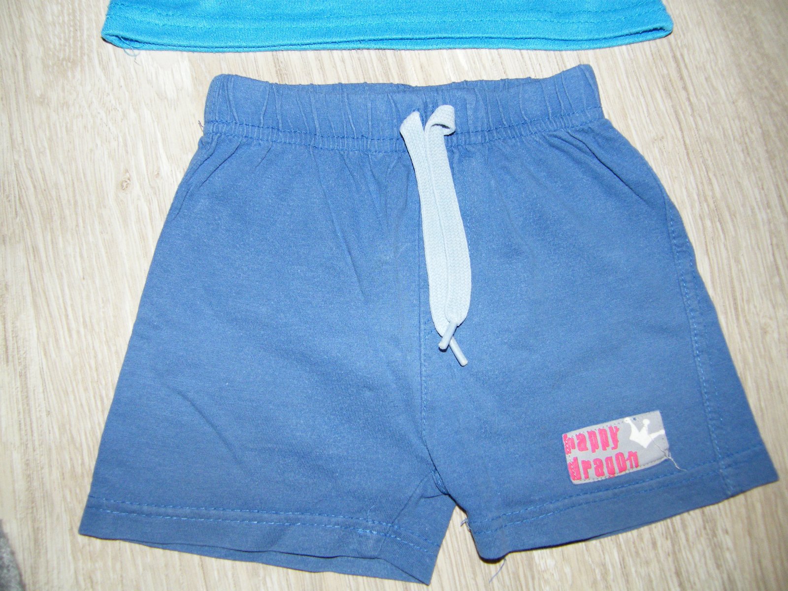 tričko ma minižmolky, na kraťasoch vidno pranie na farbe, ináč v poriadku bez poškodení. K bazénu na dvor, do piesku ešte isto poslúžia. Kraťasky sú menšia veľkosť, ale môj nosil už bez plienky ako 1-2ročný.
