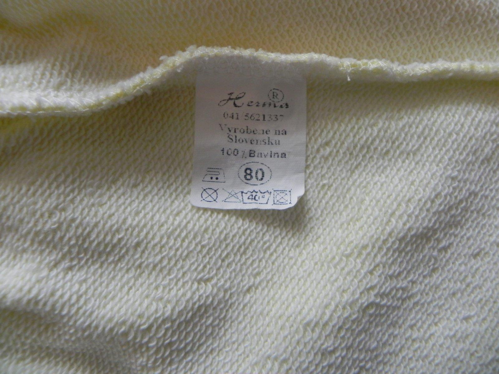 Rozmery: kabátik - 33 cm, cez hrudník 2x 31 cm, plece 7 cm, rukáv 25 cm, nohavice - dĺžka 43 cm, cez pás v kľude 2x 20 cm.