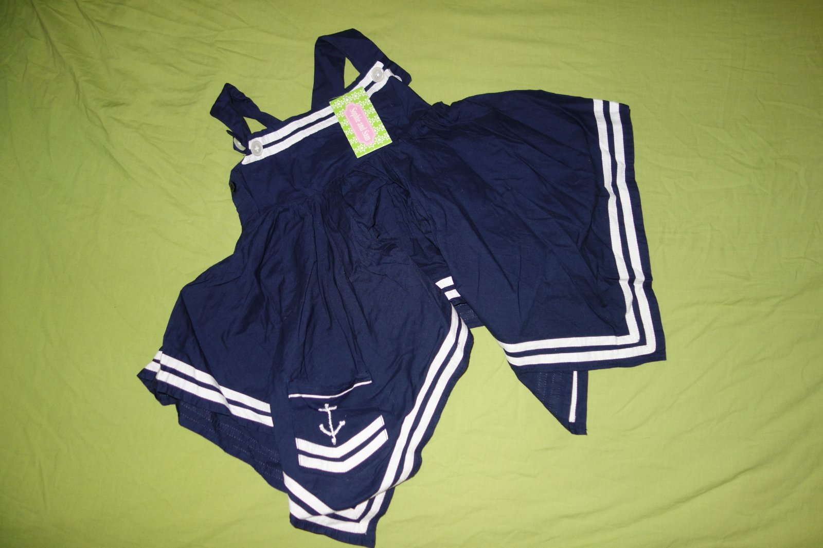 Krasne namornicky letny kompletik- novy, s visackami. Na stuzke, ktora je nasita na spodku je malicke poskodenie (vid foto)- pri noseni absolutne nevidno. Traky maju dve polohy zapinania.