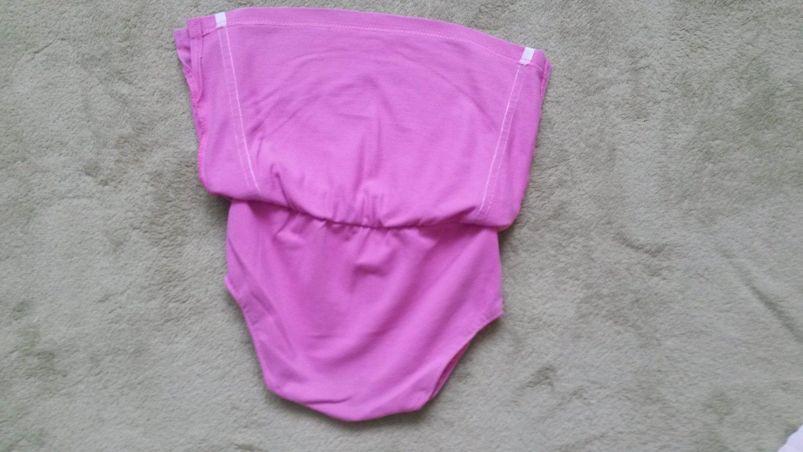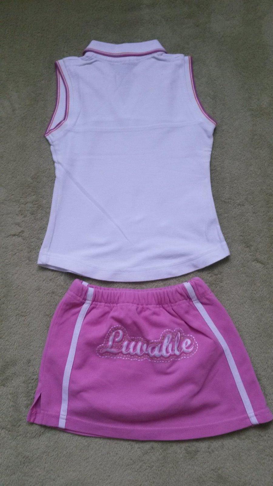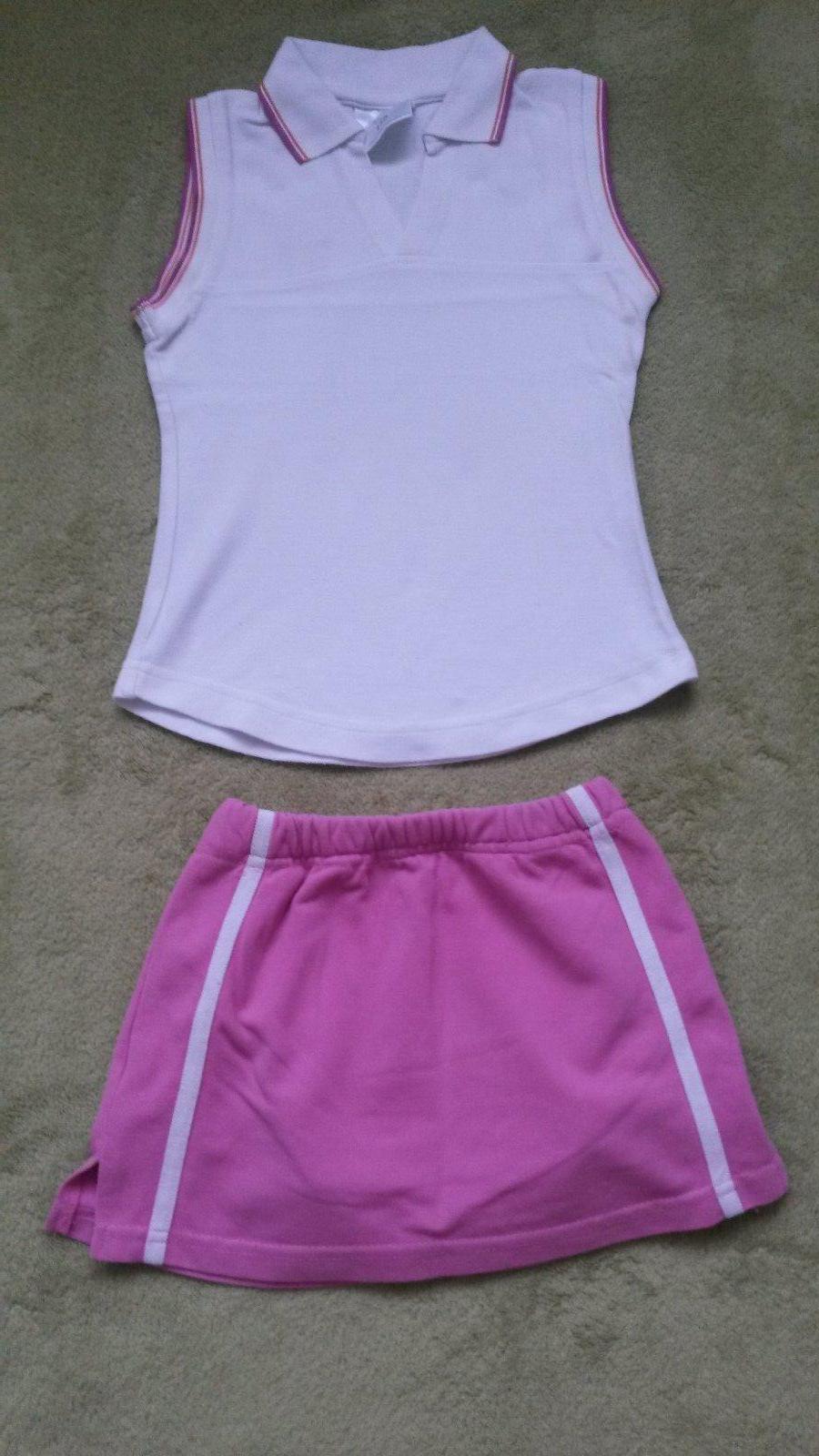 Praktický dievčenský set, (pekná, zachovalá súprava )nepatrí originál k sebe, ale pasuje to). Tričko biele bez rukávov. Límček a okolo ramien je lemované fialkovo - ruž. a zlatohnedým pasikom, má zúžený strih, diely sú dole tvarované do oblúkov.