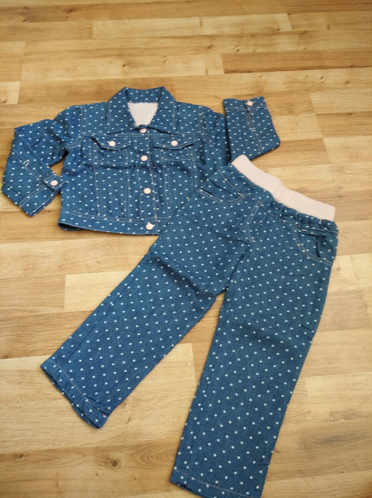 Šikovný kompletik-imitacia rifloviny. Materiál je tenká bavlna, ktorá vyzerá ako riflovina a podsite je to celé trickovimou. Bez poškodení.znacka vojcik len je štítok odstrihnúť.
