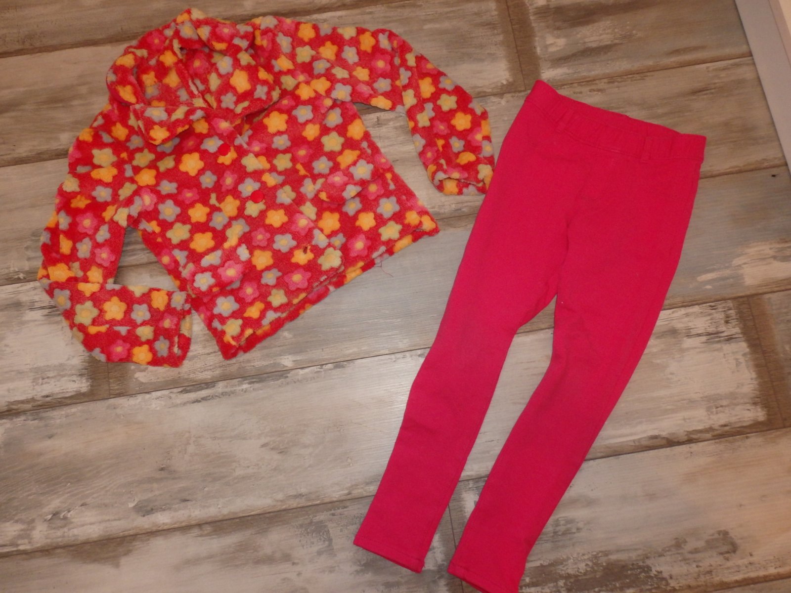 Veľmi pekný kompletík na jar a jeseň v top stave, elastické nohavice ružovej farby a pekný teplejší, ale nepodšitý svetrík, krásne pestré farby.