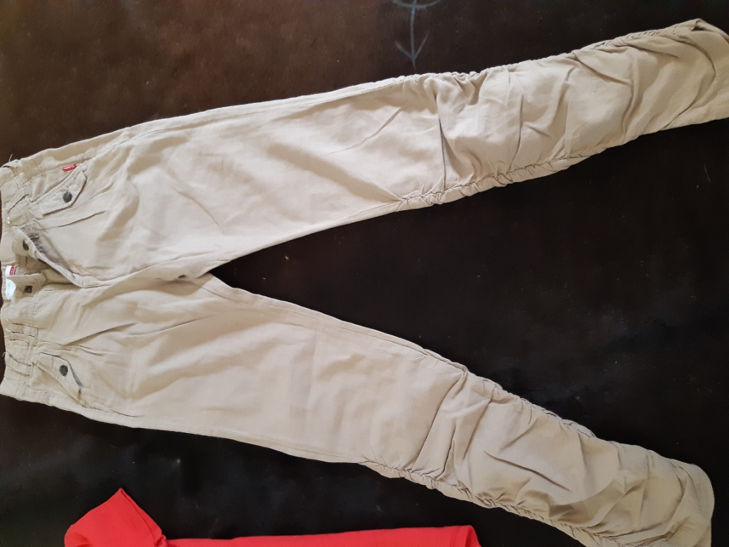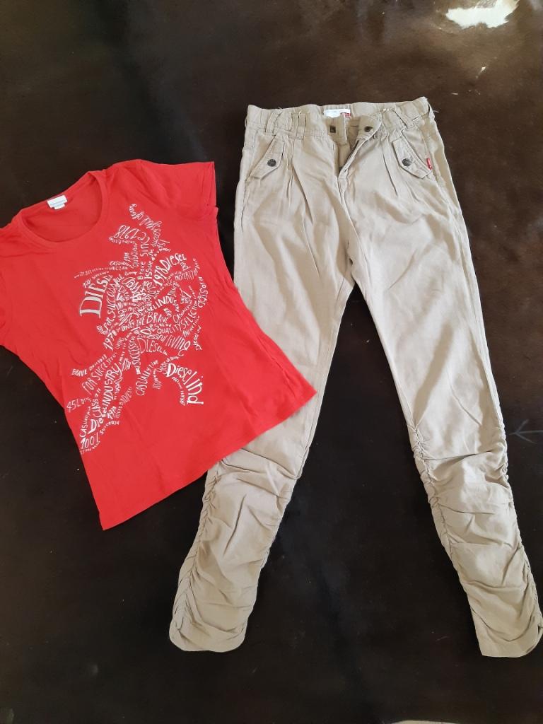nohavice a tričko - nohavice 10-11r, Kids, 100%bavlna, pieskova farba, pas 35 , dl 100, znižený klin, dole uzke stiahnuté - tričko Diesel, skor damske, S, cena spolu