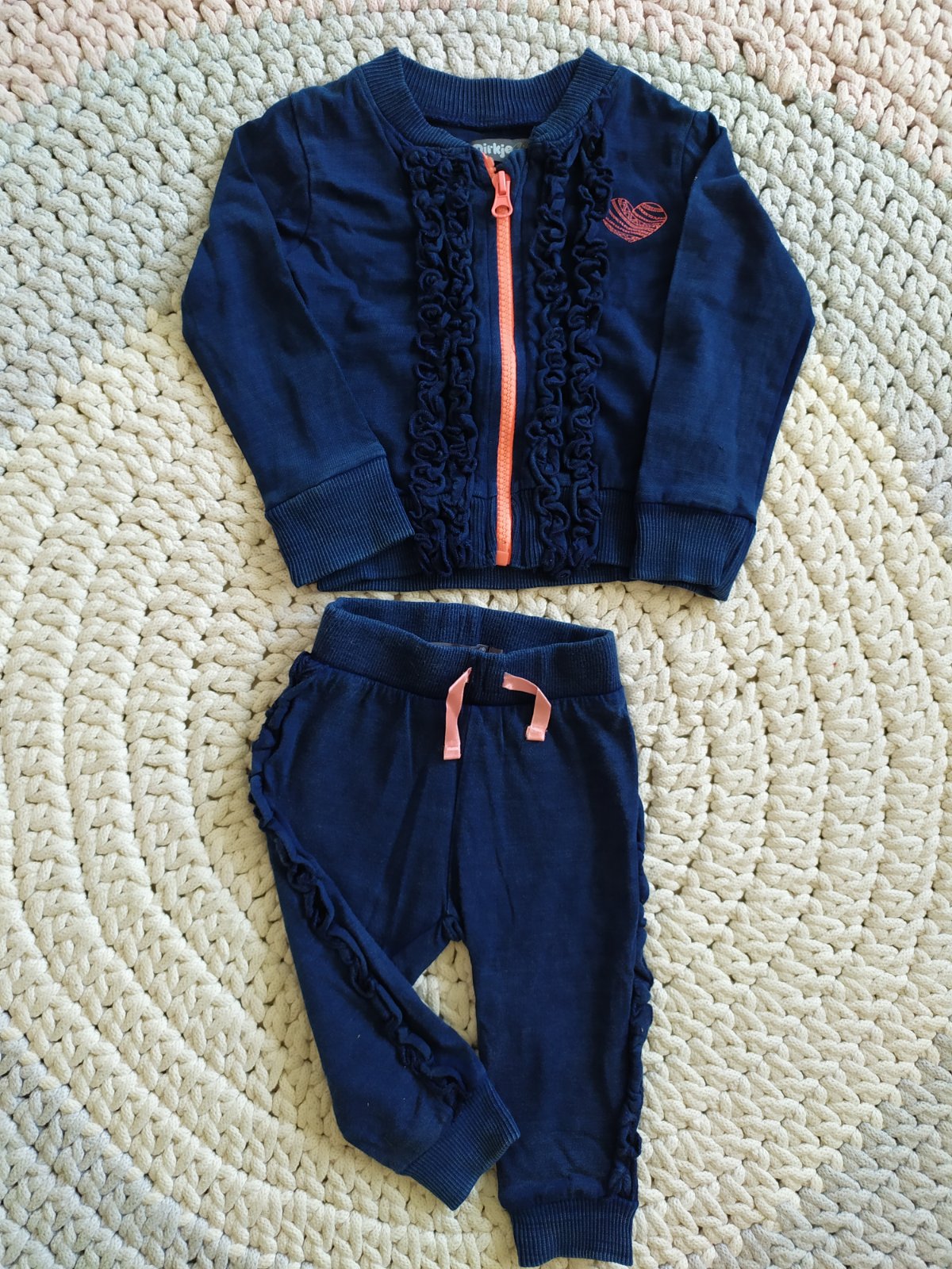 Krásná souprava s volánky z jemné vavlny.. Mikina jako nová, tepláčky prací chloupek, avšak stále ve výborném stavu.